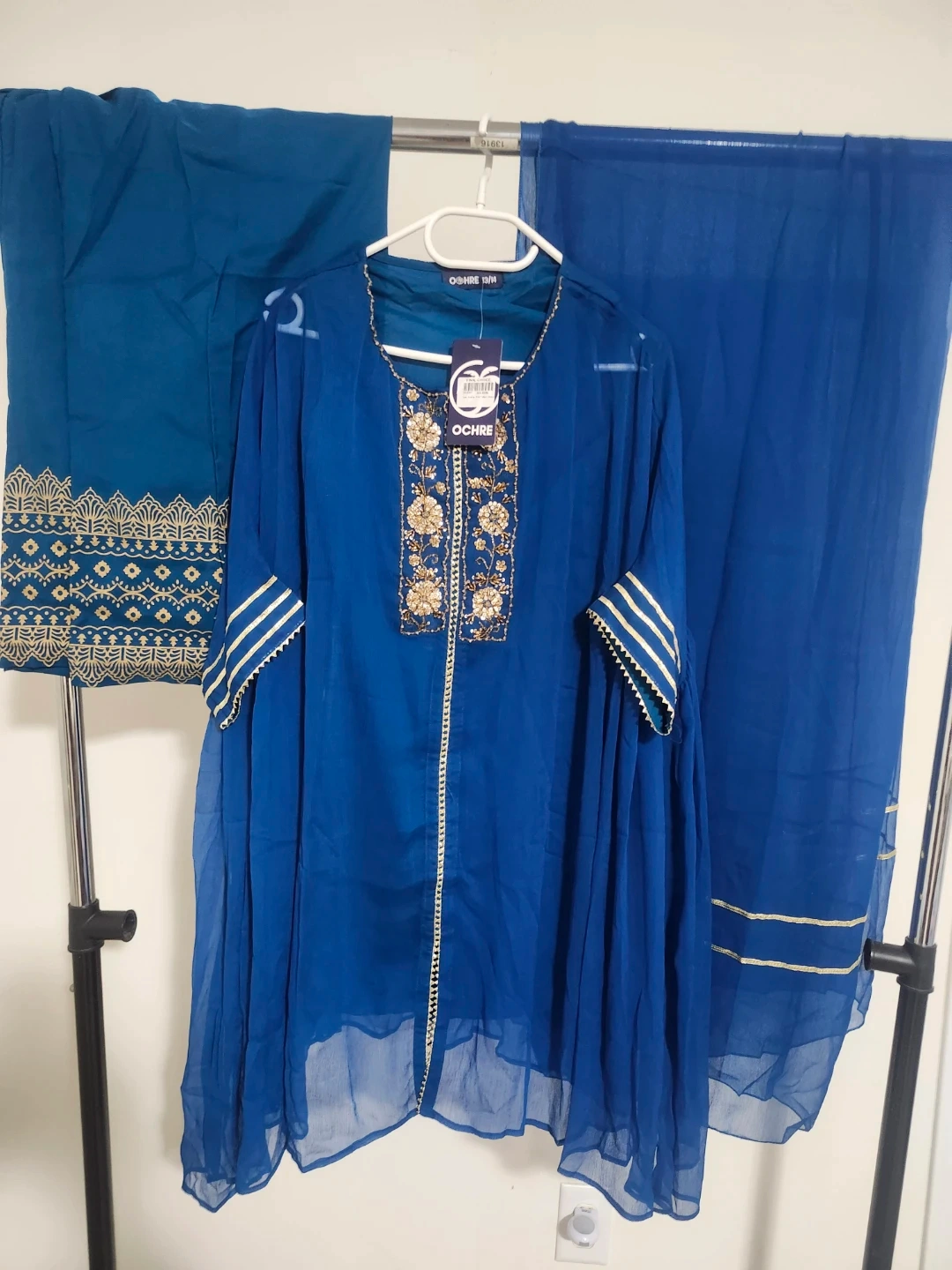 Beautiful Ochre kurti set in a vibrant blue hue. Features intricate gold embellishments on the neckline and cuffs. Comes with a matching dupatta and trousers.