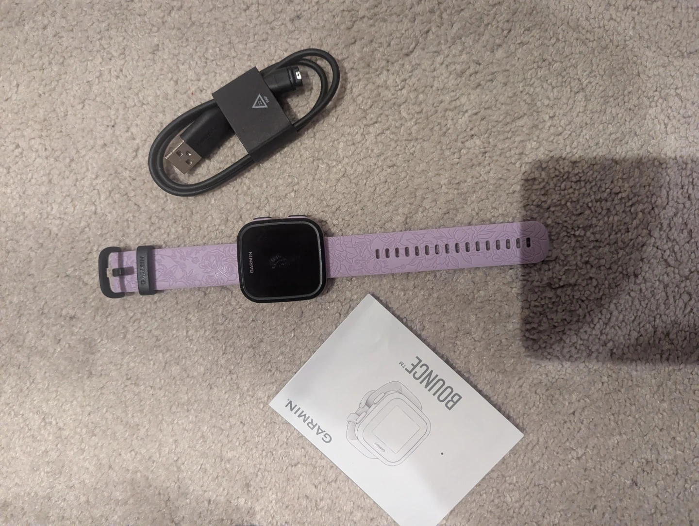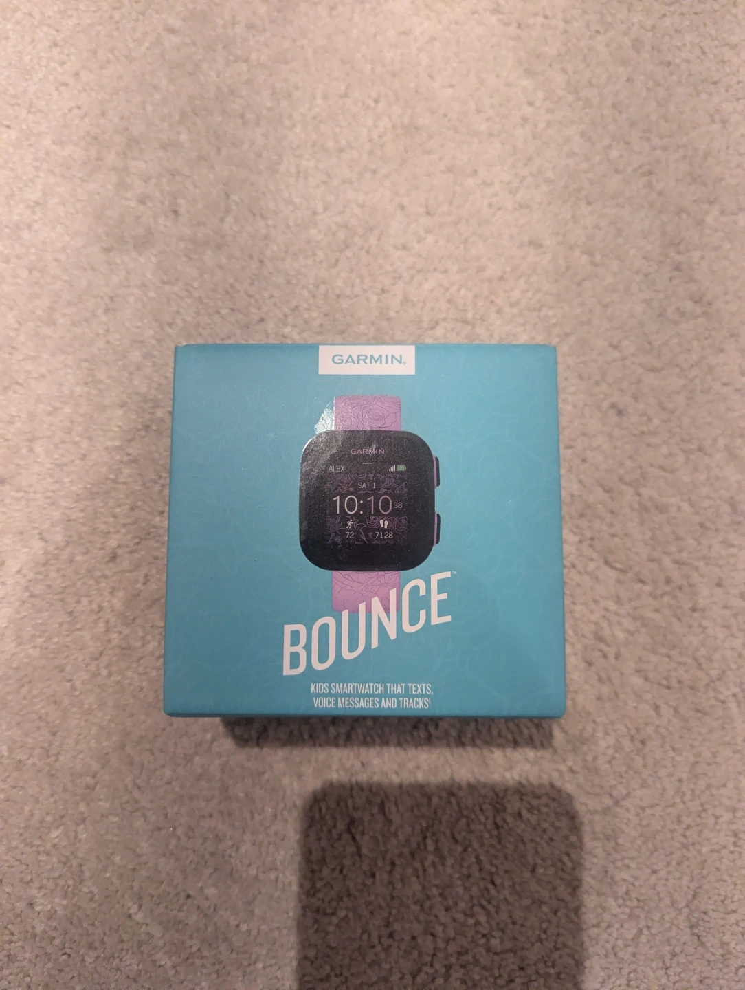 Garmin Bounce kids smartwatch in purple. It's designed for texting, voice messages, and tracking. Includes charging cable and manual.