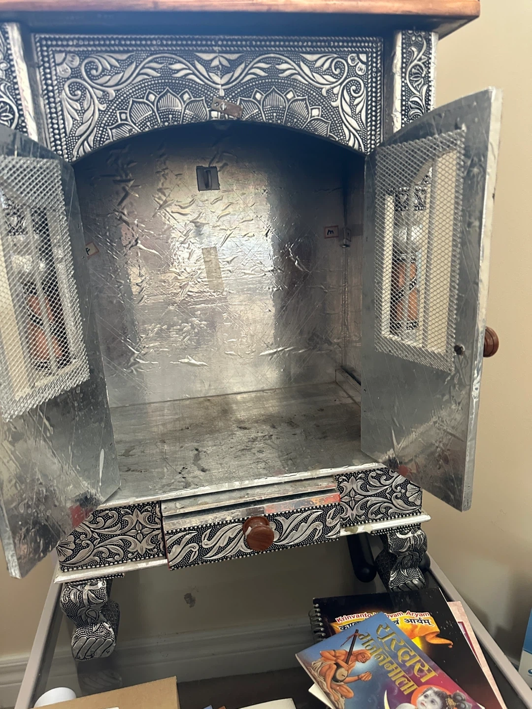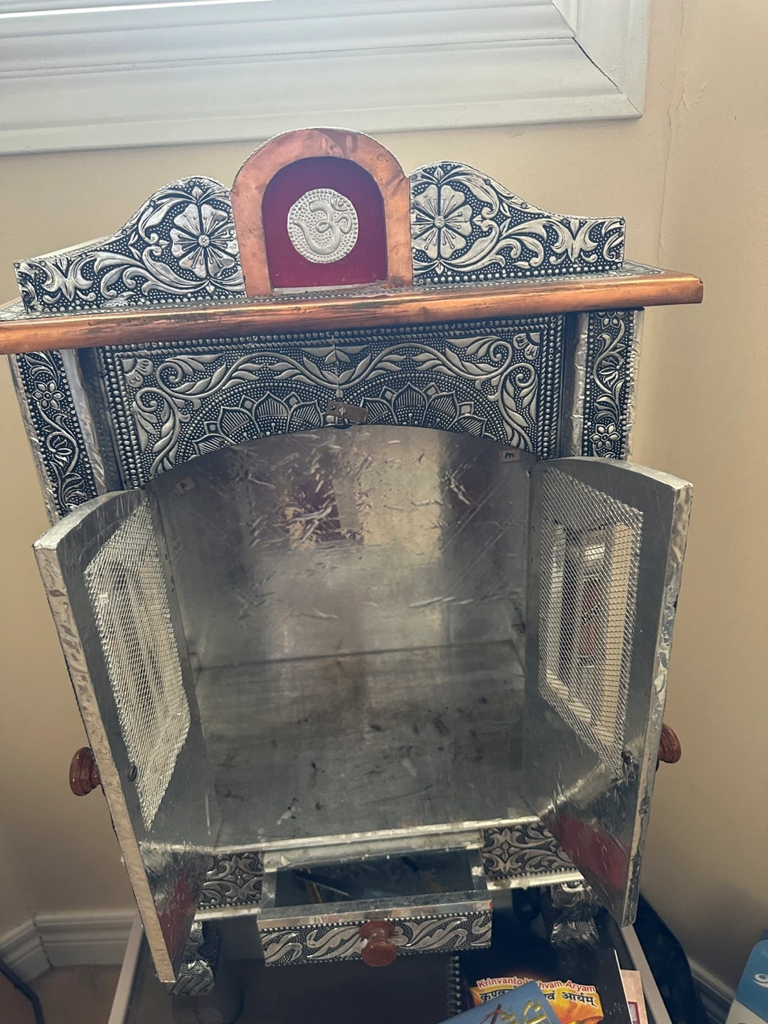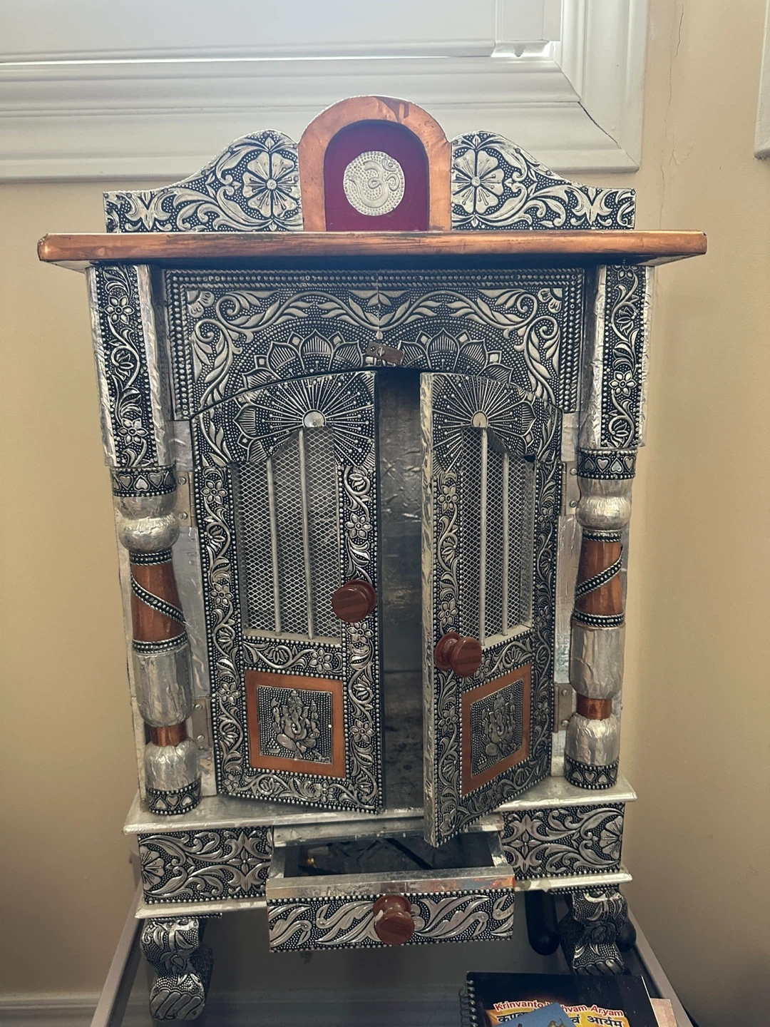 This decorative altar shelf features intricate metalwork with a silver and copper finish. It has a small drawer at the bottom for storage. It's suitable for displaying religious idols or keepsakes. The ornate design makes it a beautiful accent piece for your home!