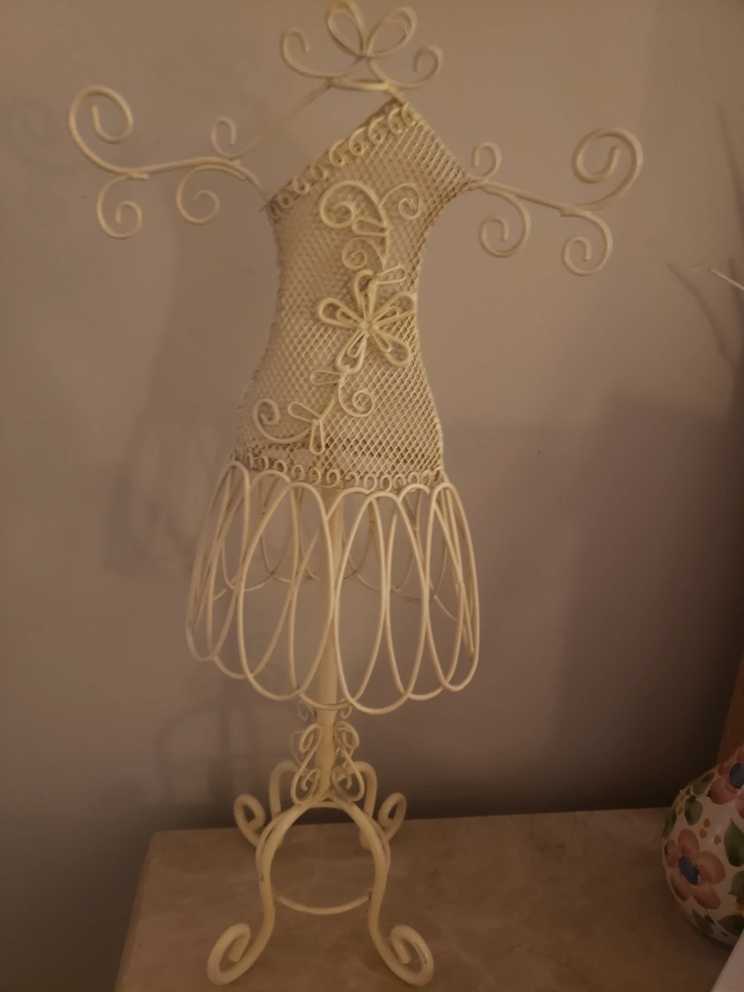 This decorative dress form display stand is made of metal wire. It has a cream-white finish and features an ornate floral design. This stand is perfect for displaying jewellery or small accessories.