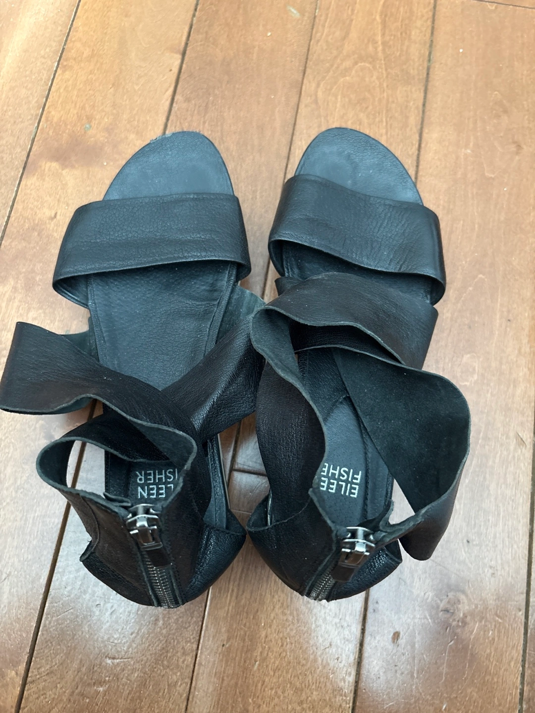 Eileen Fisher black leather sandals with zipper ankle straps. These sandals have a distinctive wrap-around strap design and a sturdy sole. Leather upper and lining.