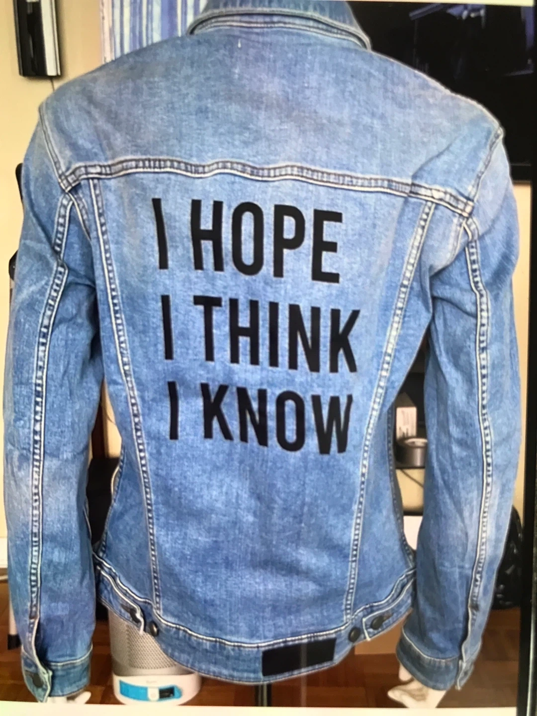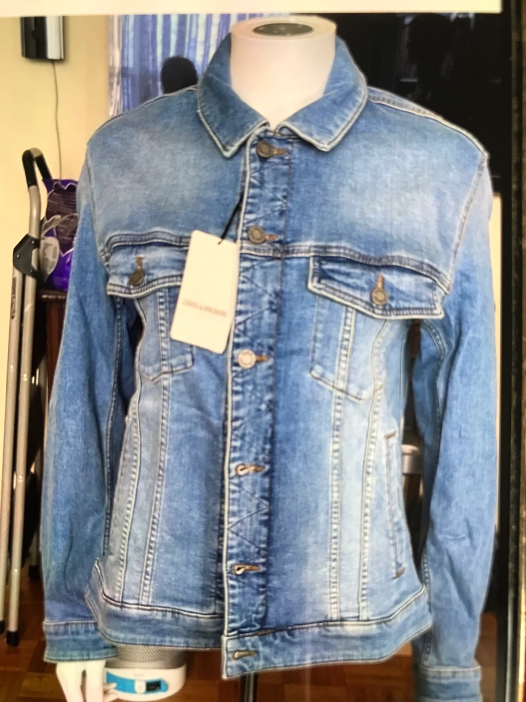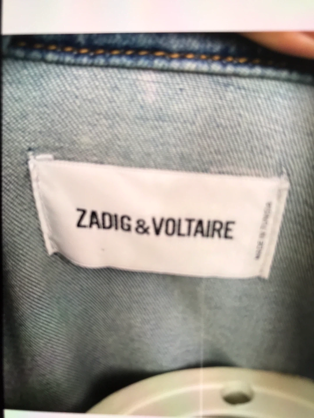 This Zadig & Voltaire denim jacket features the "I HOPE I THINK I KNOW" graphic on the back. It's a light blue wash with a zip-up front and button closures. Made in Tunisia. Size S.