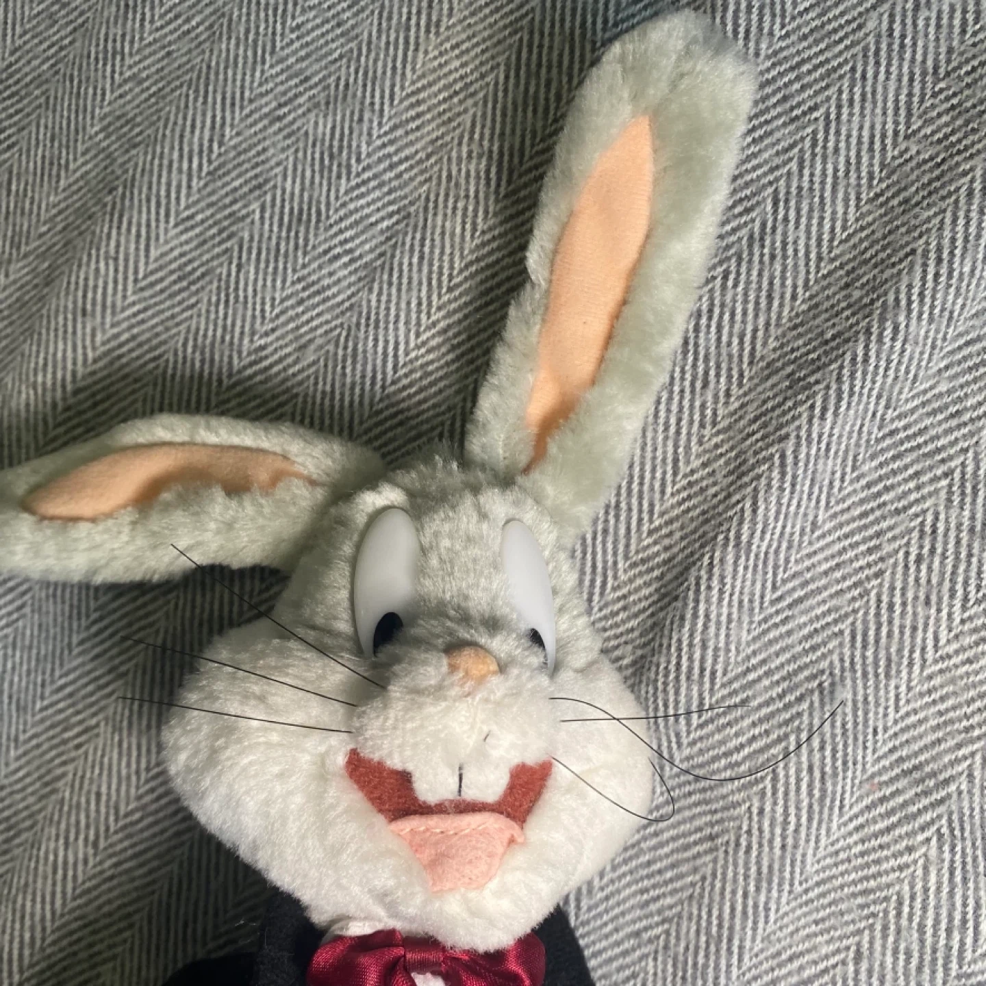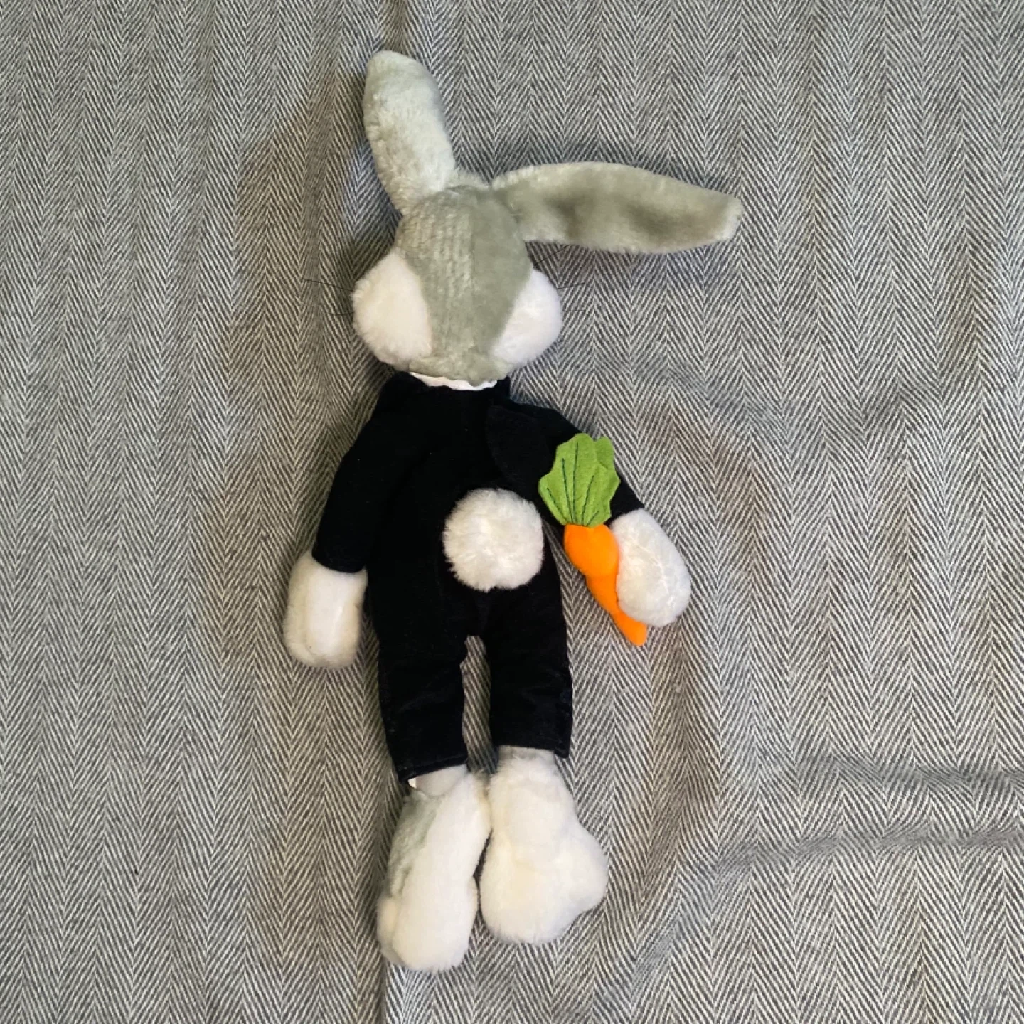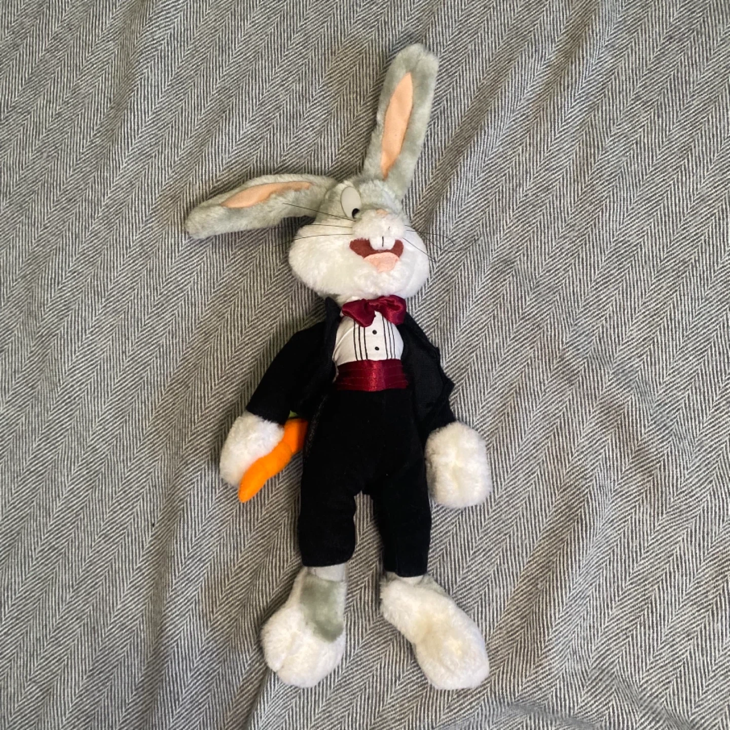 This is a vintage 90’s Bugs Bunny plush toy dressed in a tuxedo. It's holding a carrot accessory. The plush is soft and makes a fun collectible.