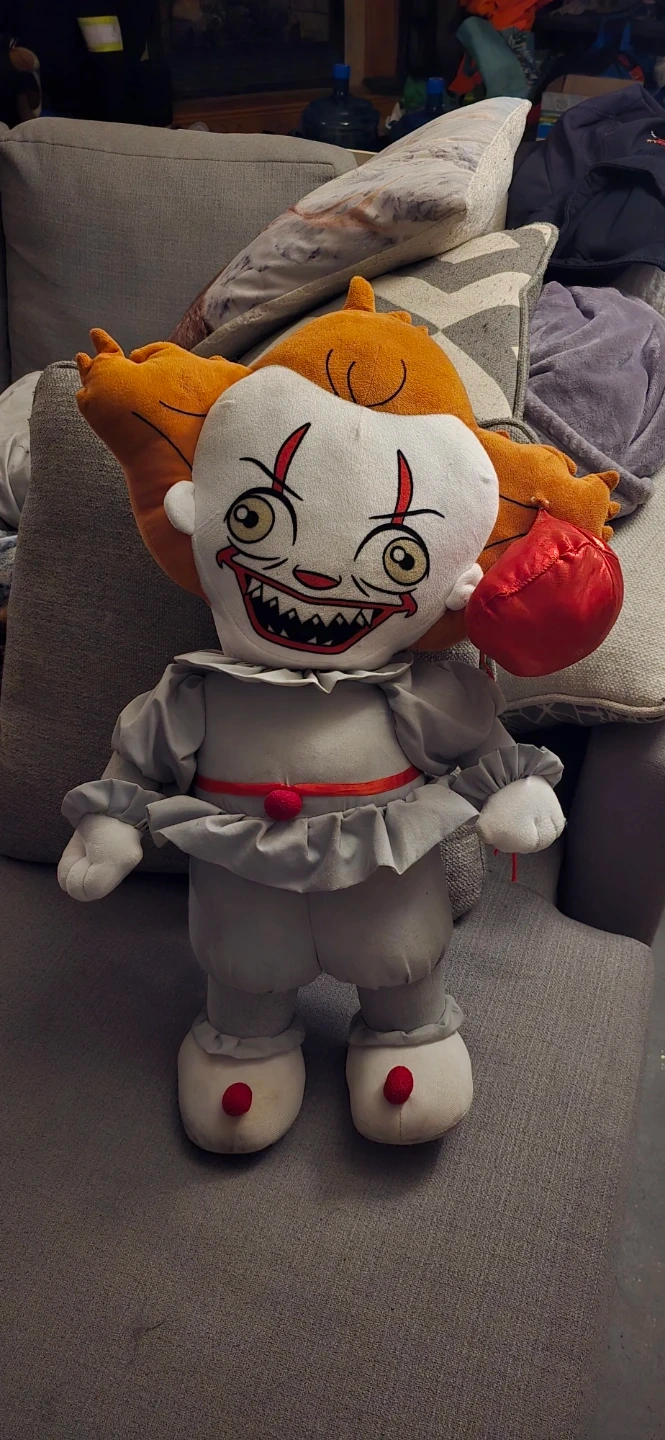 This is a plush toy of Pennywise the clown, complete with his signature red balloon. It's about 18 inches tall and made of soft fabric. Great for fans of horror or unique decor!