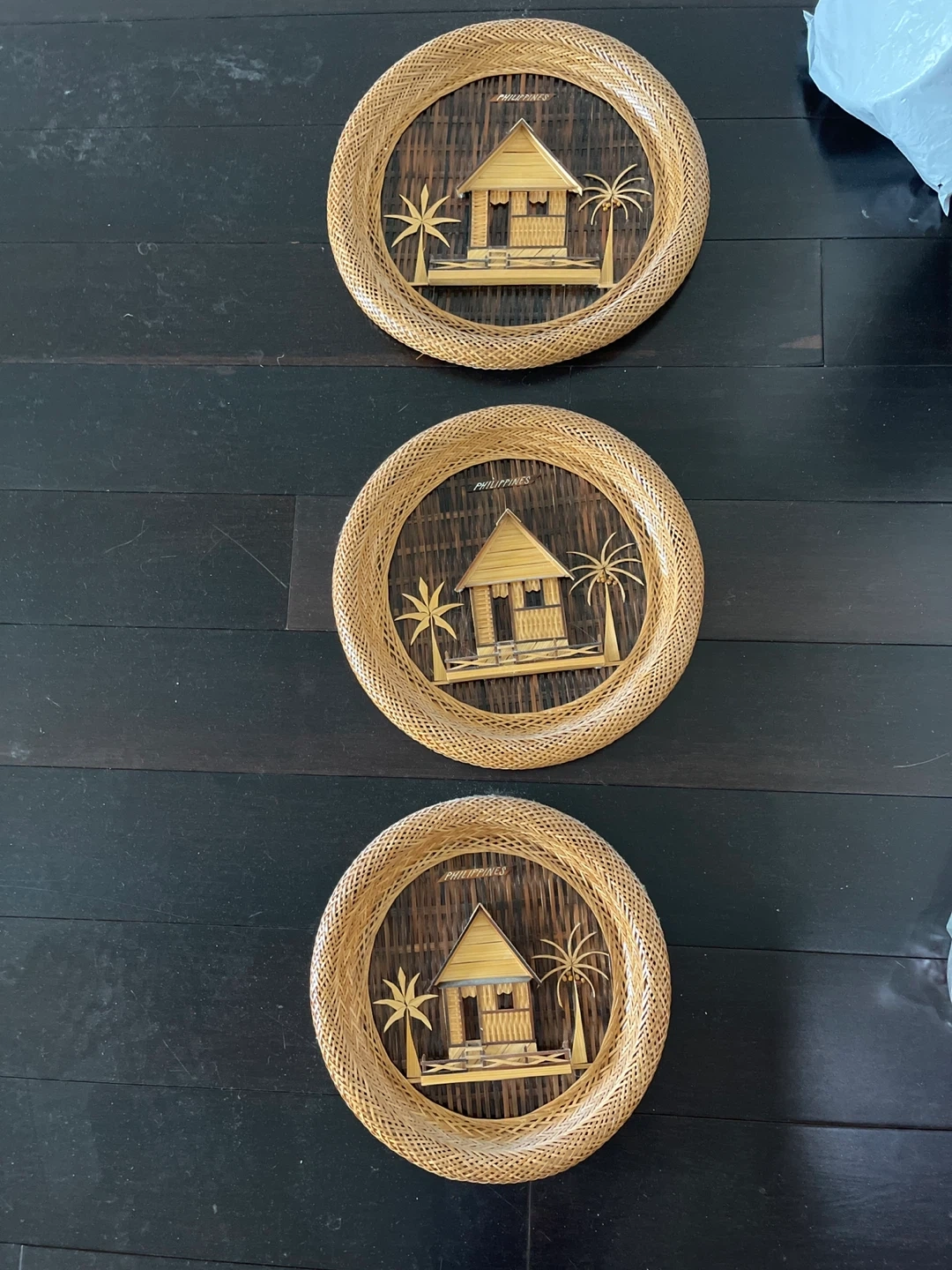 These three round wall hangings feature a woven rattan frame with a detailed depiction of a hut and palm trees, labelled 'Philippines'. They're a lovely accent piece for any room!