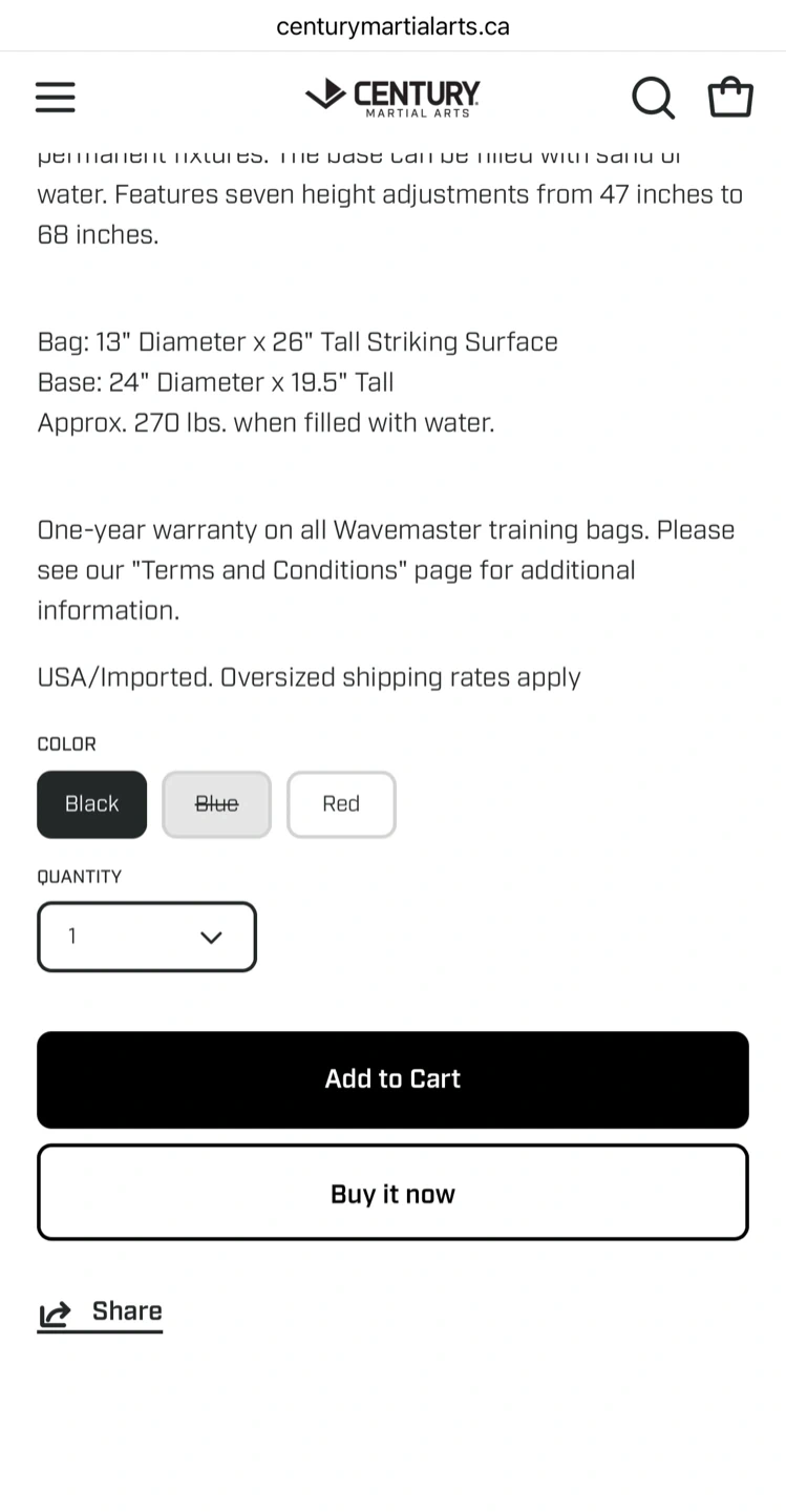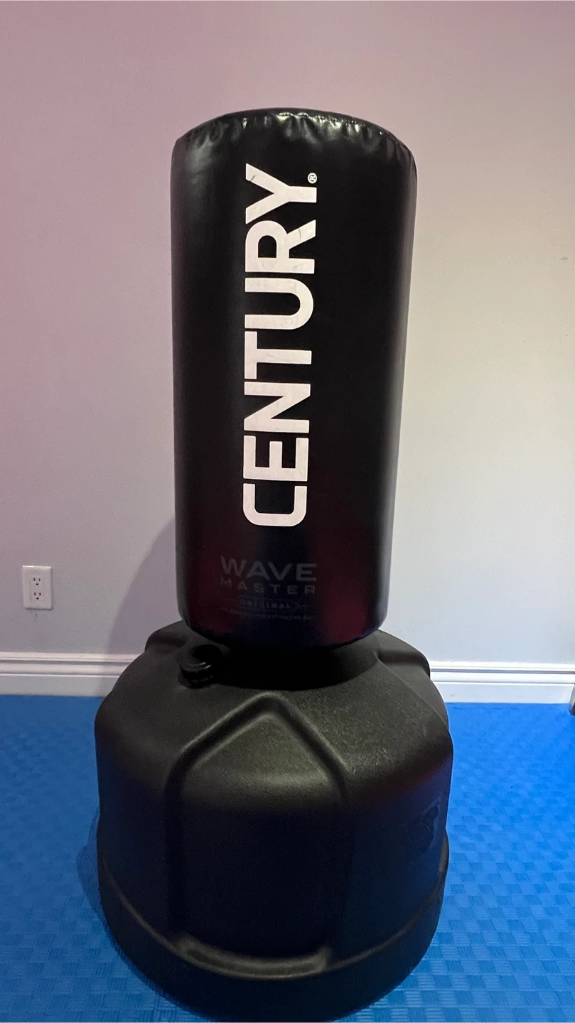 This Century Wavemaster Original is a freestanding heavy bag designed for developing kicks, punches, and strikes. It has a striking surface measuring 13" diameter x 26" tall. The base is 24" diameter x 19.5" tall and can be filled with water for stability, holding approx. 270 lbs. when filled. This bag is excellent for training at home!