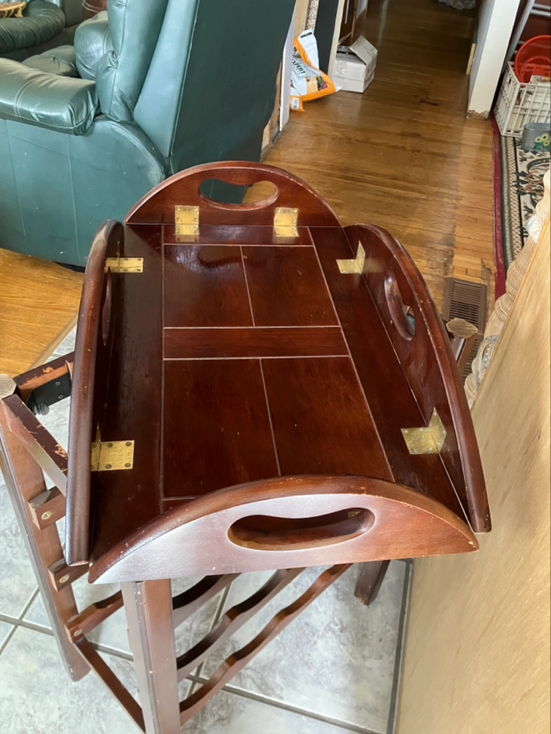 Dark brown wooden wine rack. Features a removable serving tray with brass hinges. Holds approximately six bottles of wine. Some minor wear and tear.