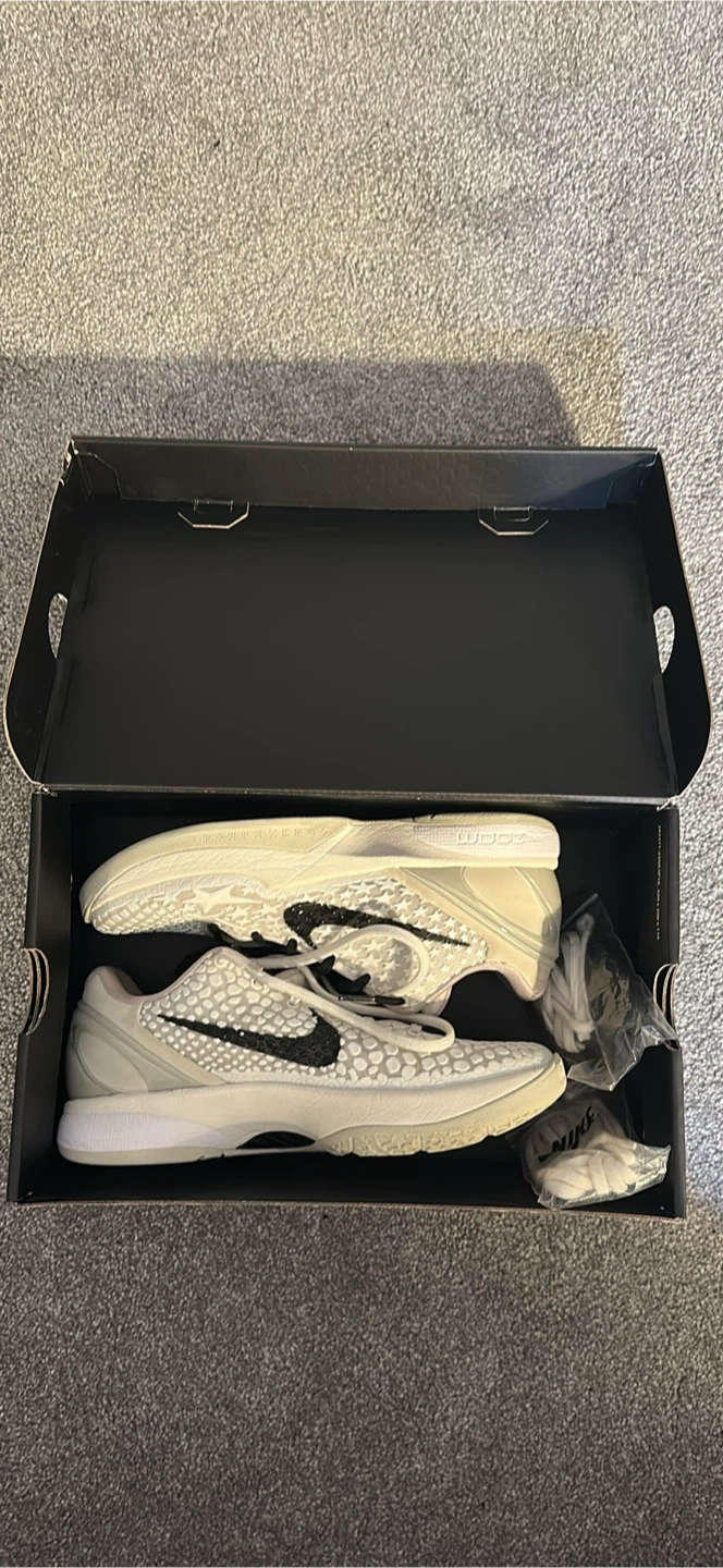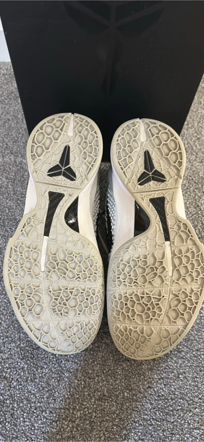These Nike Kobe 6 Protro sneakers come with their original box and two extra pairs of laces. They're in a light grey colourway with a black and white speckled pattern. The shoes feature a rubber sole with a unique tread pattern for grip.size 6.5 worn twice trades work also
