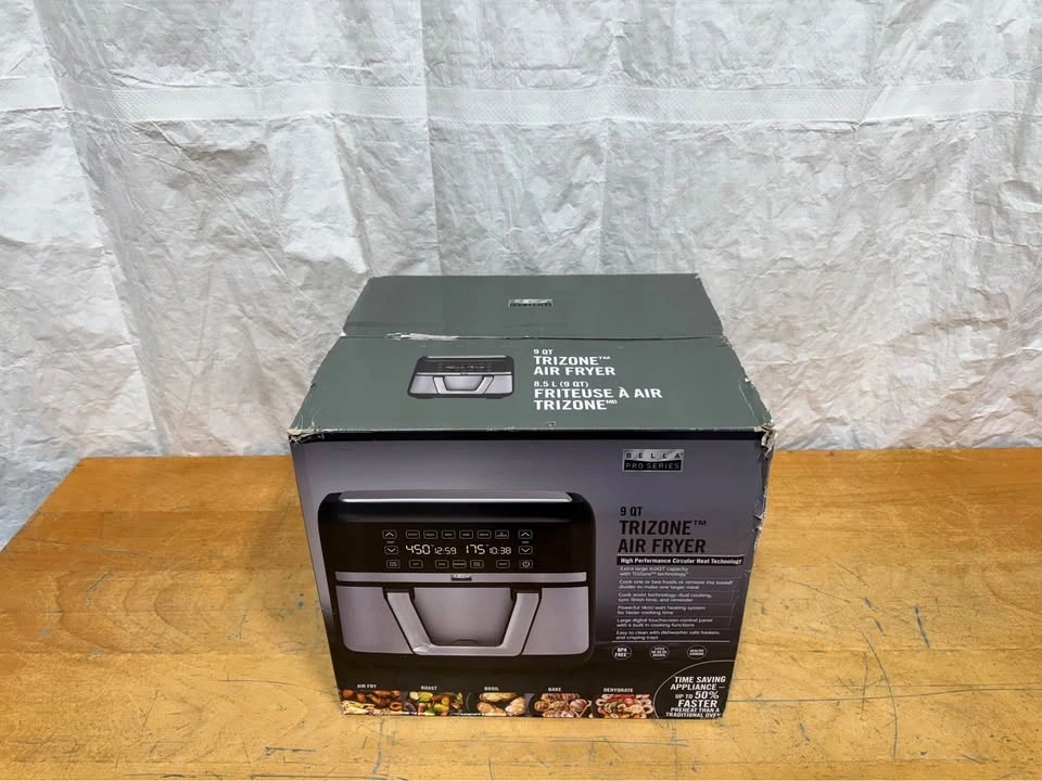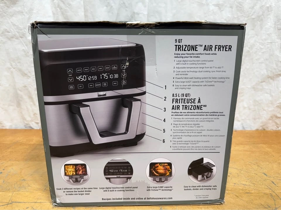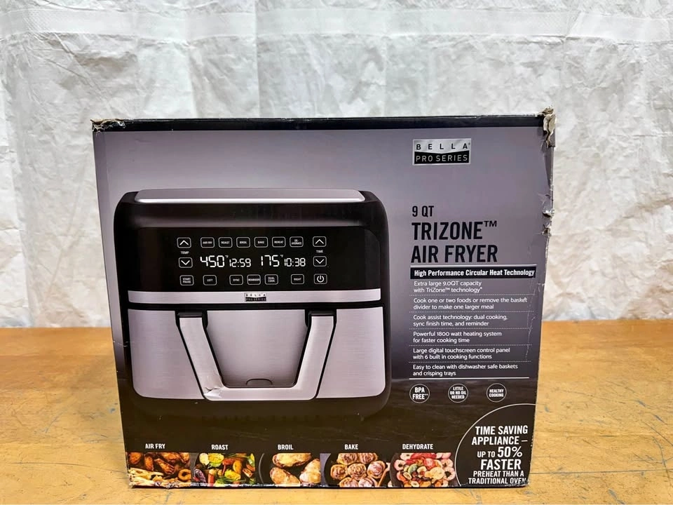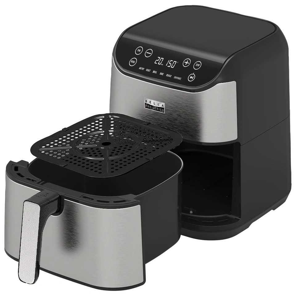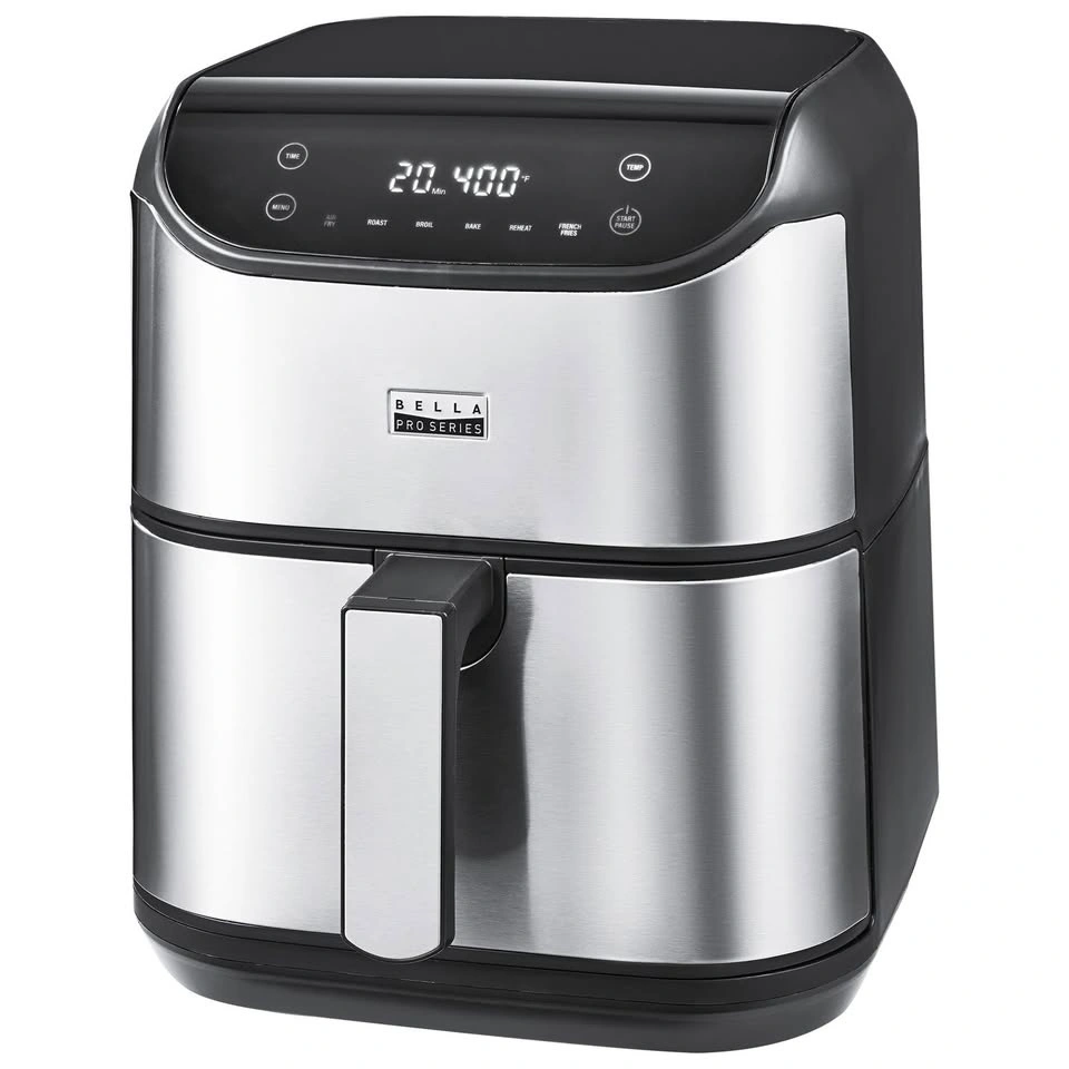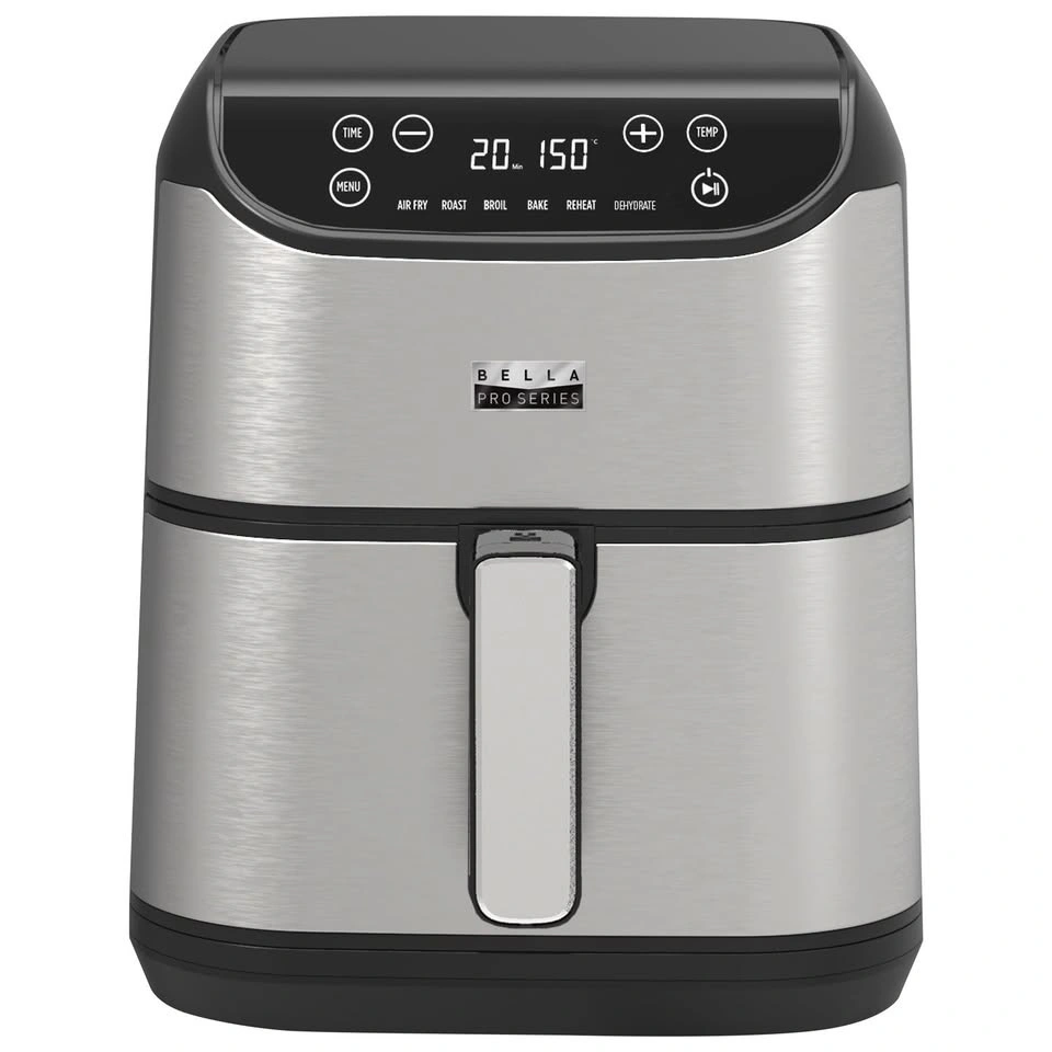 Bella Pro Series 6-Quart Air Fryer. Perfect for everyday meals and family cooking. BRAND NEW sealed in box. This is a true multi-function kitchen appliance, not just an air fryer. What it does: Air Fry (crispy fries, wings, nuggets), Bake (pizza, pastries, desserts), Roast (chicken, veggies, salmon), Broil (steaks, chops, melts), Reheat (leftovers without sogginess), Dehydrate (fruit, jerky, snacks). Features: Large 6-quart capacity for 6-7 people. Digital touchscreen with preset cooking modes. 1500W power for fast, even cooking. Digital touchscreen provides adjustable temperatures from 170F-400F. Built-in timer with Auto shut off and audible tone. Non-stick basket - PFOA free, easy to clean and dishwasher safe. Stainless steel finish adds modern appeal to your countertops. Uses little to no oil. Includes a collection of recipes to help you get started!