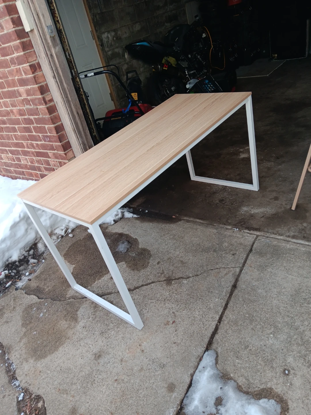 This modern desk features a natural wood top and sleek white metal legs. It's perfect for a home office or study space. The tabletop is made of wood, and the base is constructed from durable metal.