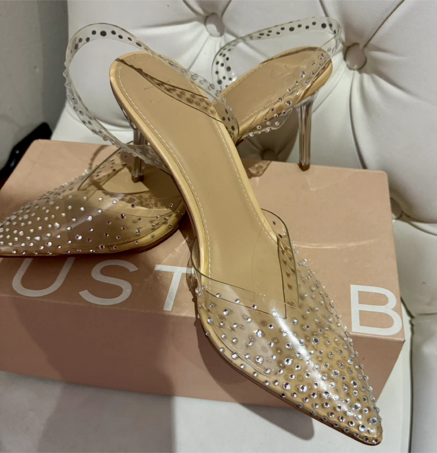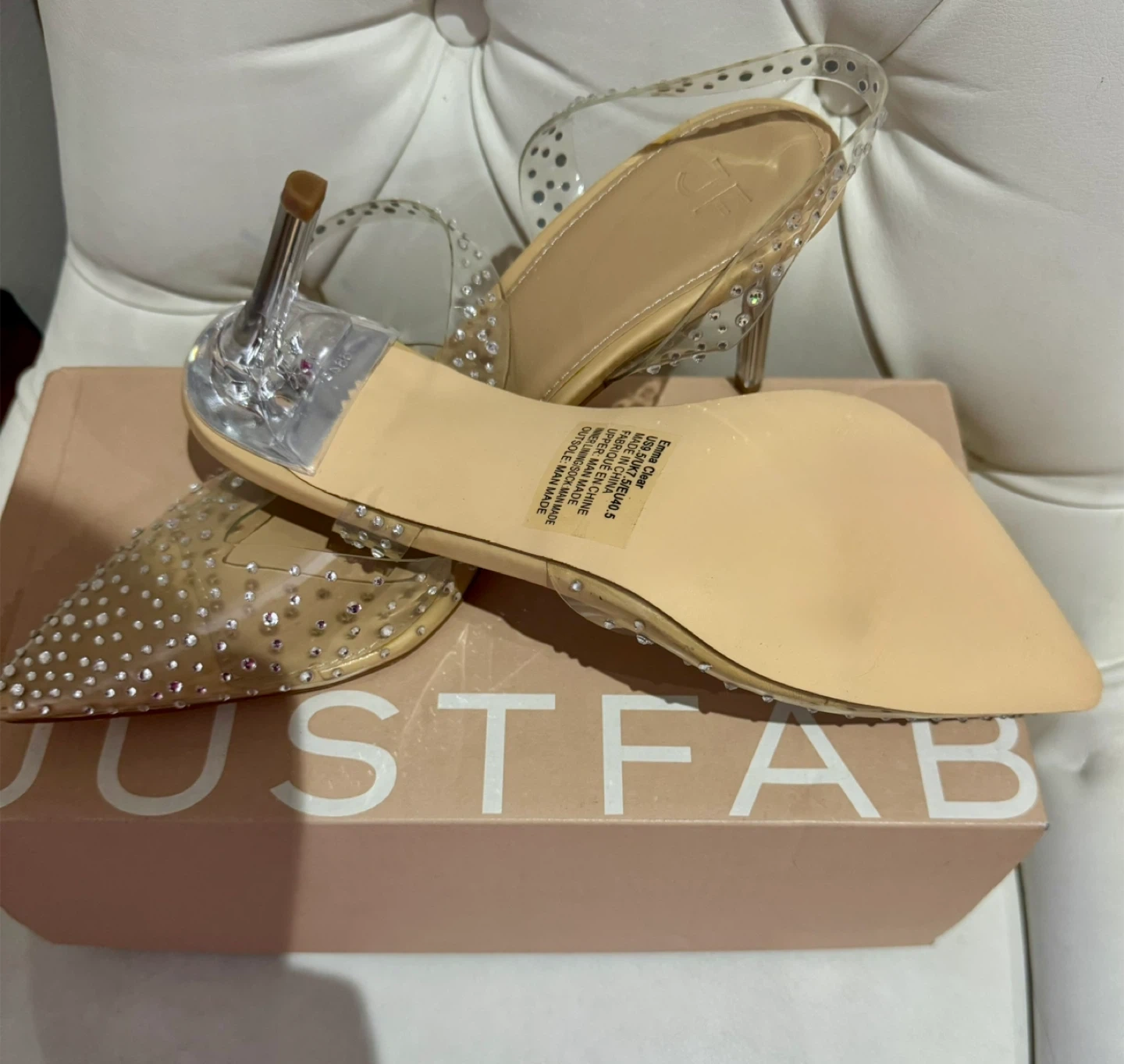 Selling a pair of JustFab Emma Clear Embellished pumps in size 9.5. These stylish pumps come in their original box and are in great condition. Perfect for adding a touch of sparkle to any outfit!
