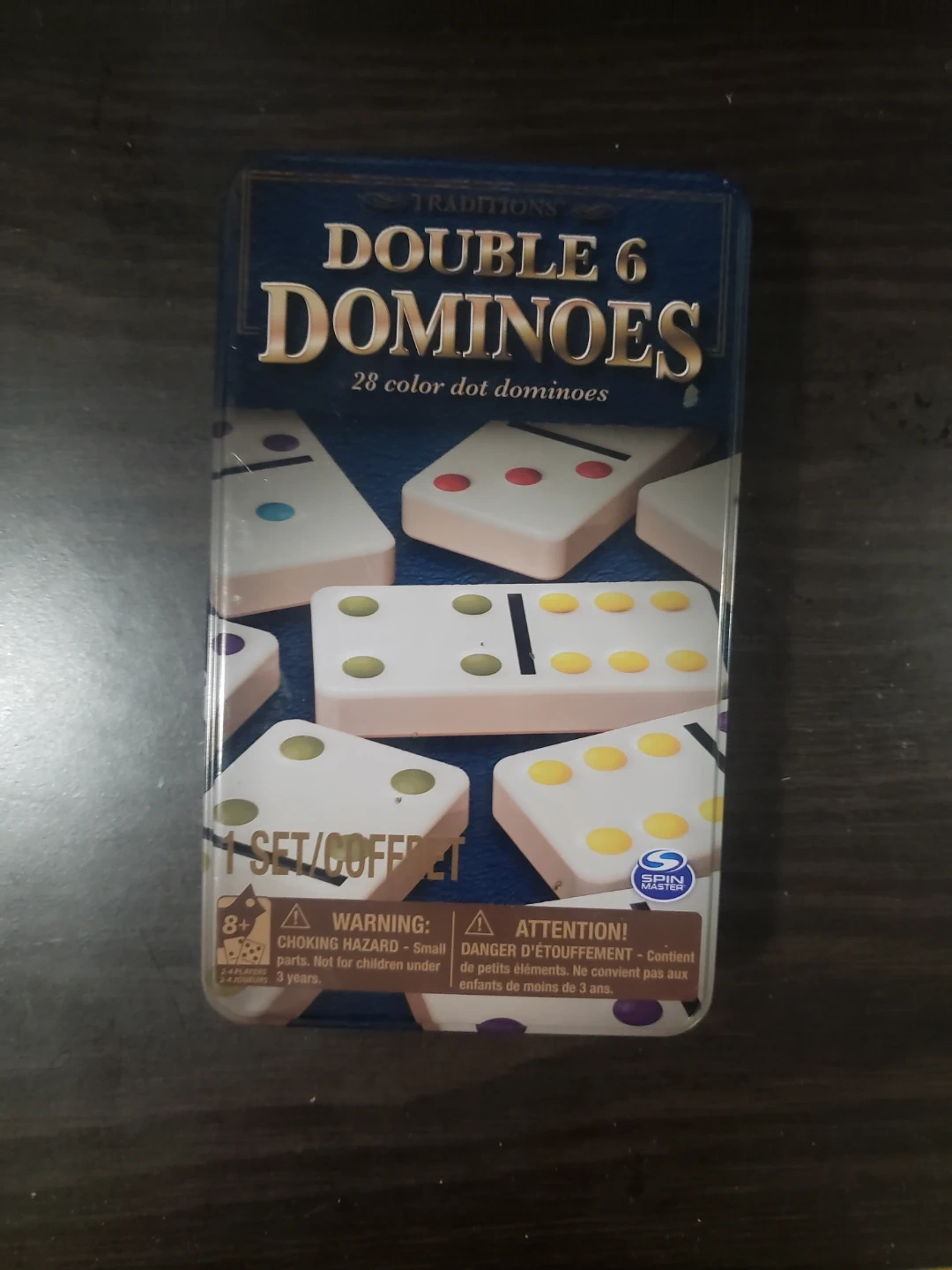 A set of 28 double six dominoes with color dots, all in a handy tin case. These dominoes are great for game nights or travel. It's a classic game for all ages!