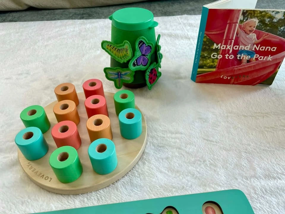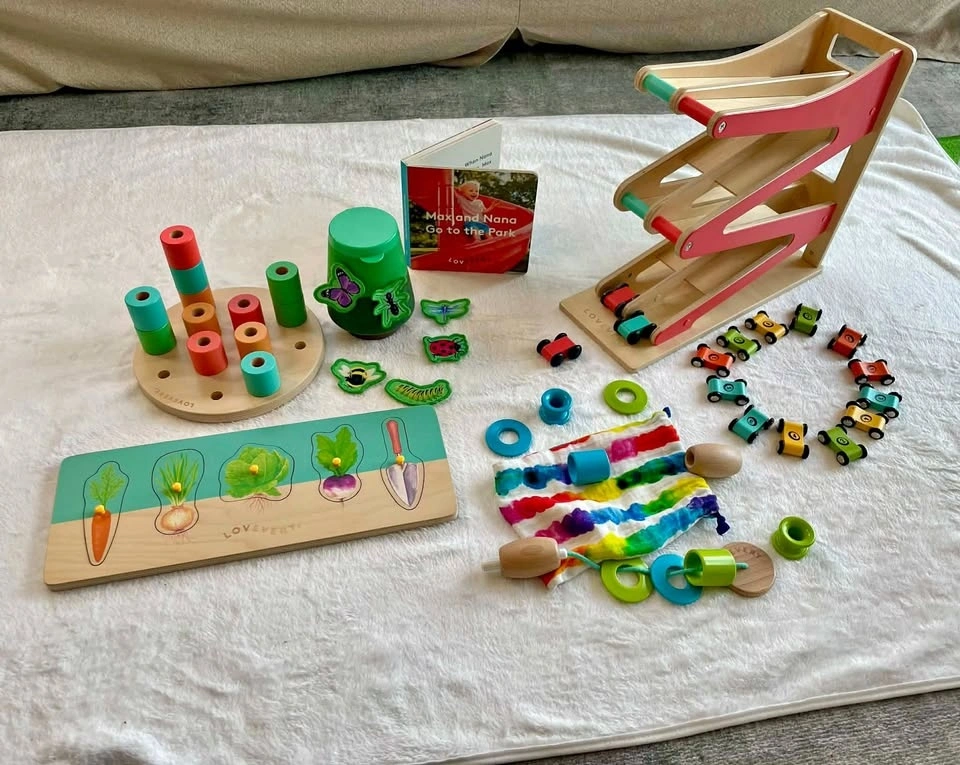 Give your busy toddler the play they crave! This kit helps build two-handed coordination, improve finger strength, and introduce empathy. Includes a Race & Chase Ramp with 12 extra cars, 'Max and Nana Go to the Park' board book about managing emotions, a Threadable Bead Kit for fine motor skills, a Drawstring Bag, a Wooden Stacking Pegboard, a Community Garden Vegetable Puzzle to practice pincer grasp, and a Fuzzy Bug Shrub with Velcro critters. Play Guide is not included.