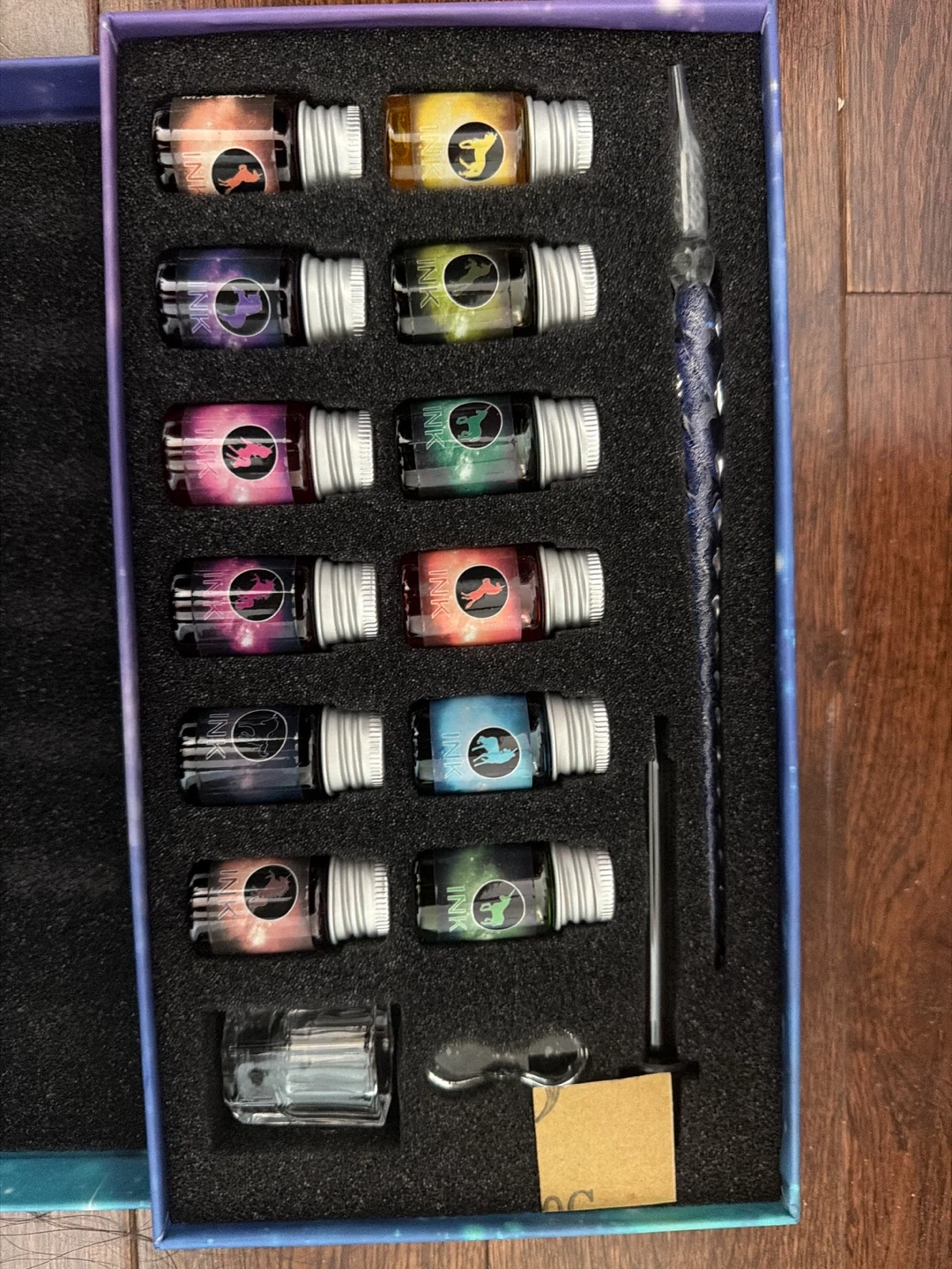 This set includes a glass dip pen and ten bottles of coloured ink. The inks are in various vibrant shades. It comes with a small glass inkwell and a pen holder.