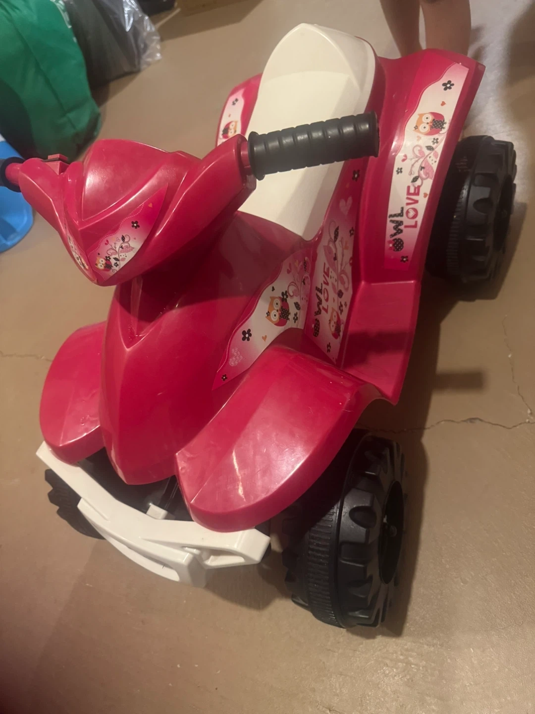 This is a fun pink ride-on ATV for kids! It features cute owl and heart decals with 'OWL LOVE' text. Durable plastic construction with sturdy wheels for indoor or outdoor play. A great way for little ones to zoom around!