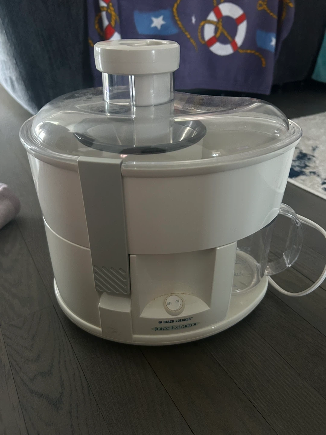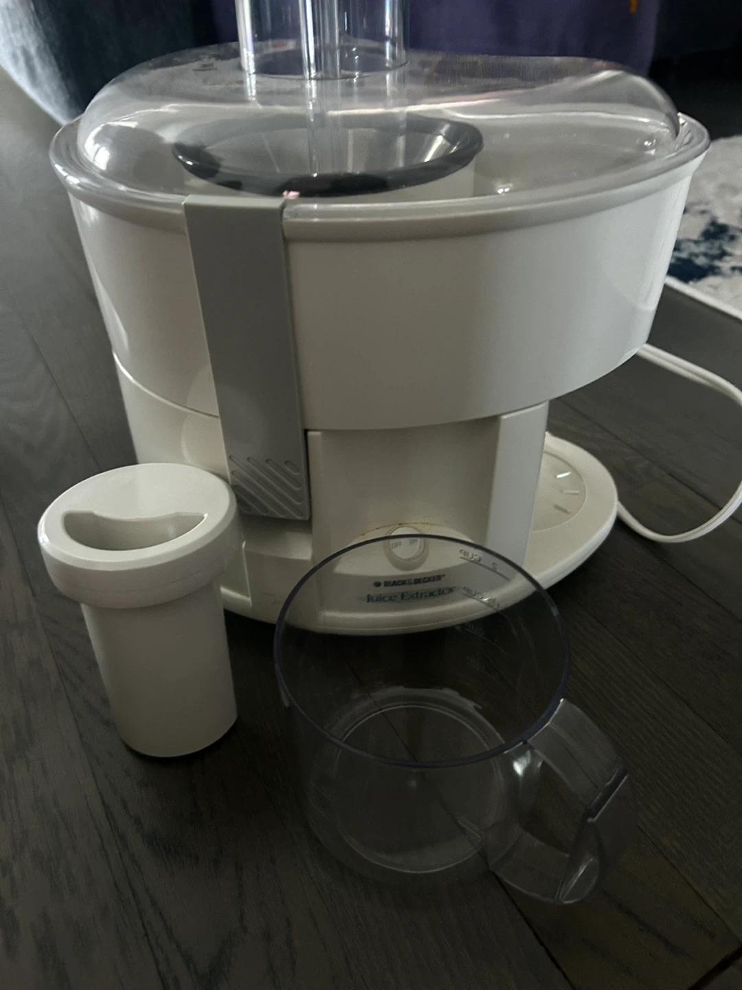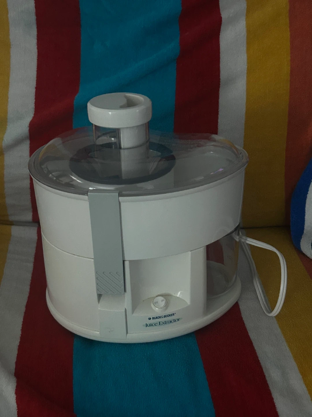 This is a BLACK+DECKER juice extractor. It's white and comes with a pulp bin and juice cup. It has a wide chute for easy juicing. Used Once!