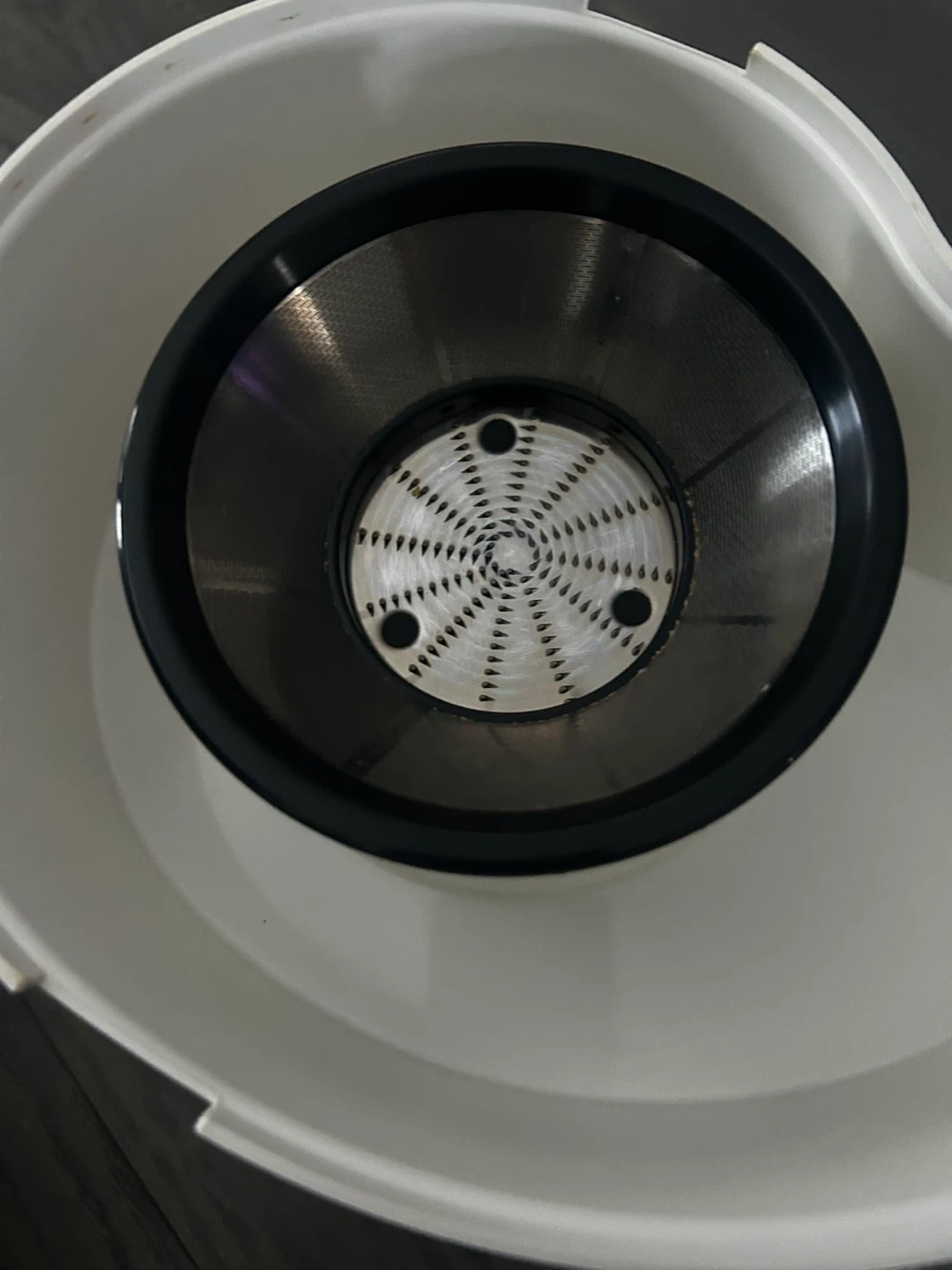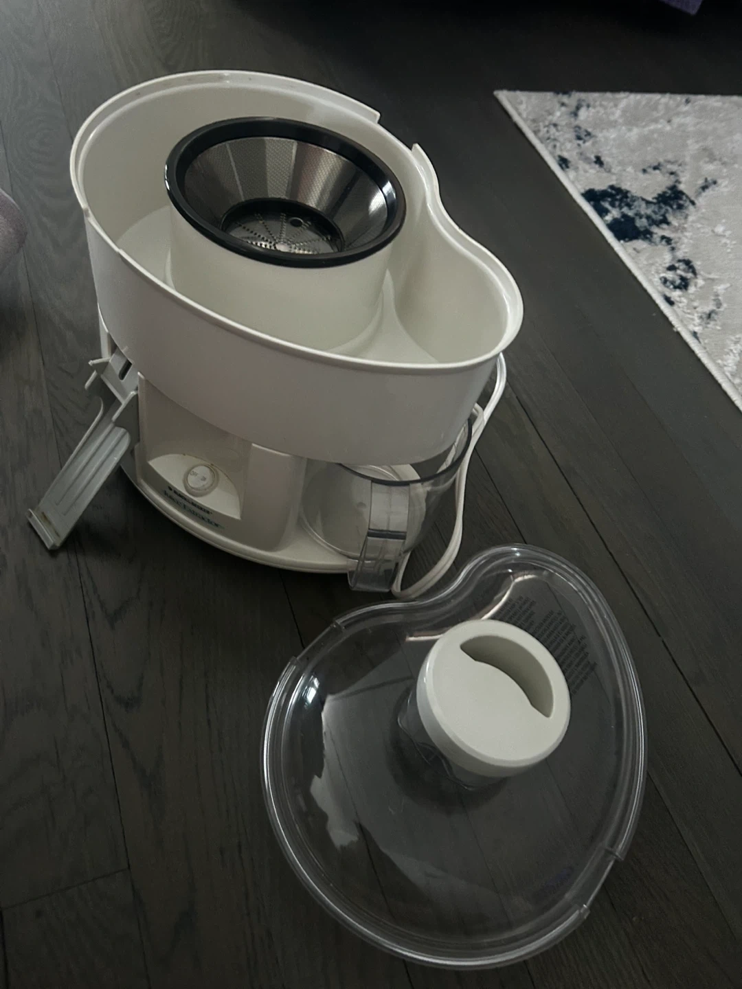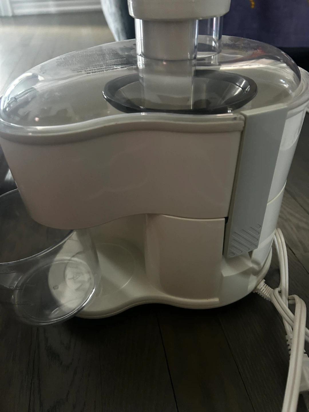 This is a BLACK+DECKER juice extractor. It's white and comes with a pulp bin and juice cup. It has a wide chute for easy juicing. Used Once!