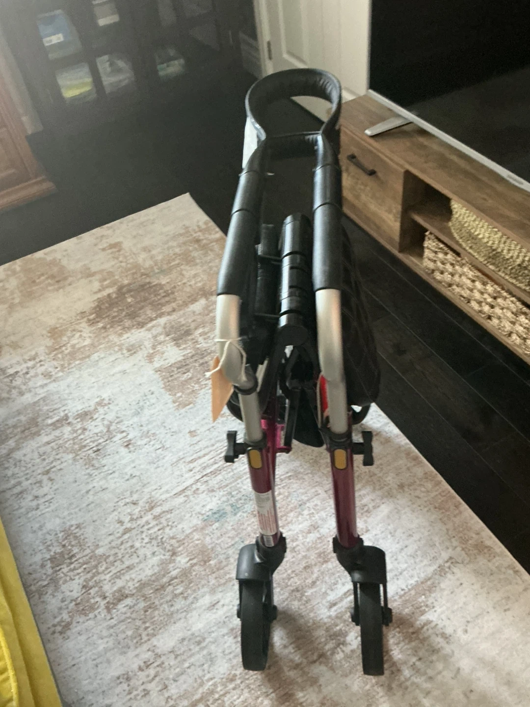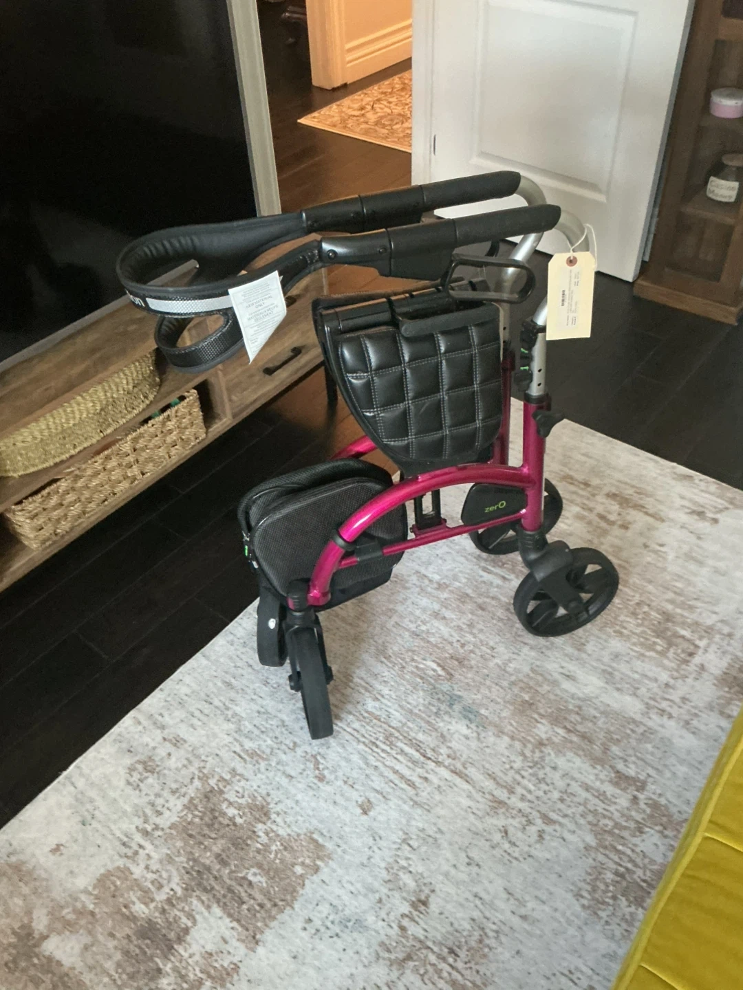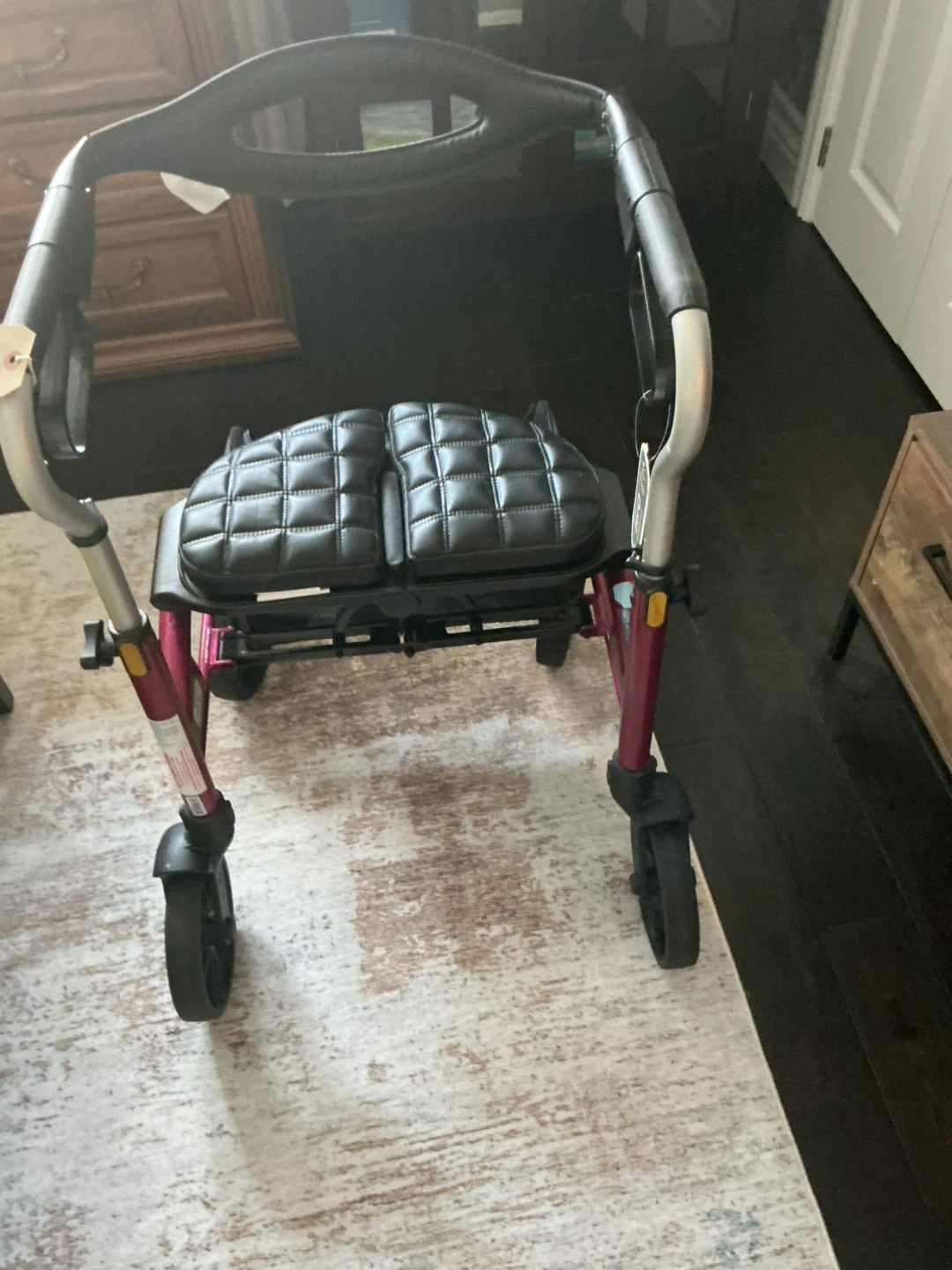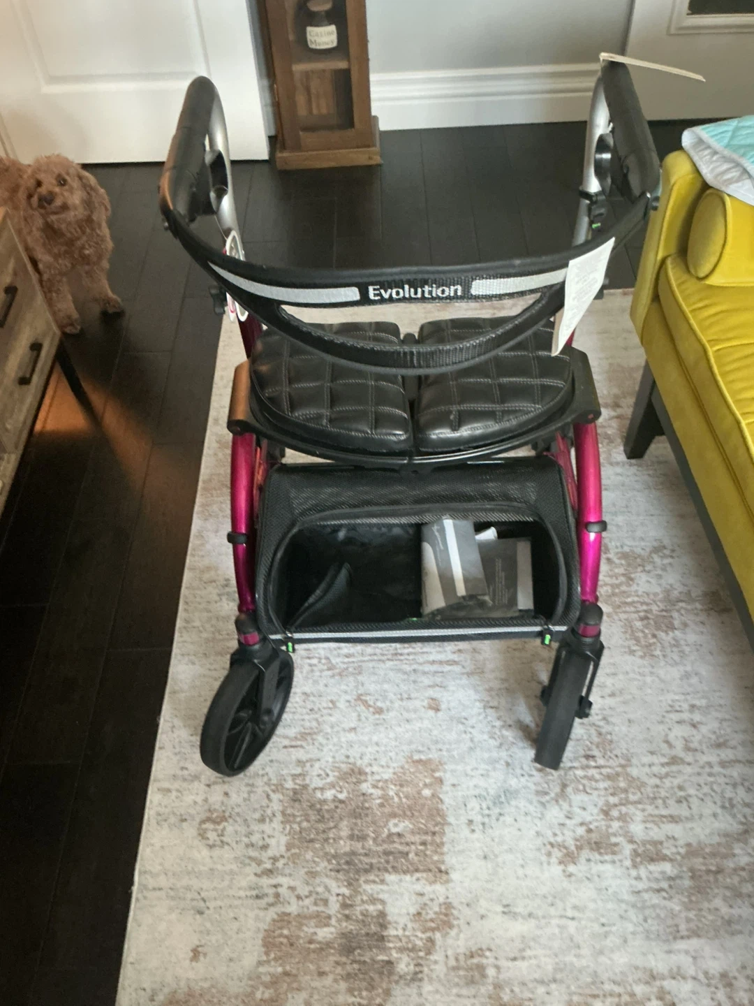 This Evolution Medical rollator walker is in a striking fuchsia colour. It features a padded seat and a storage basket for convenience. It's designed for mobility assistance.