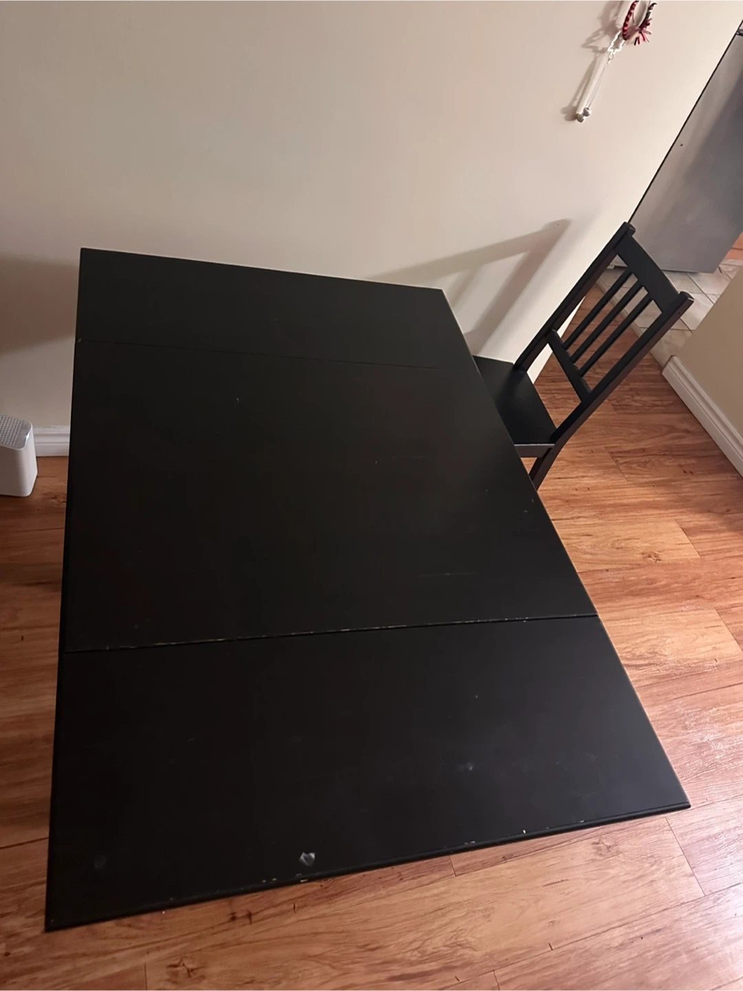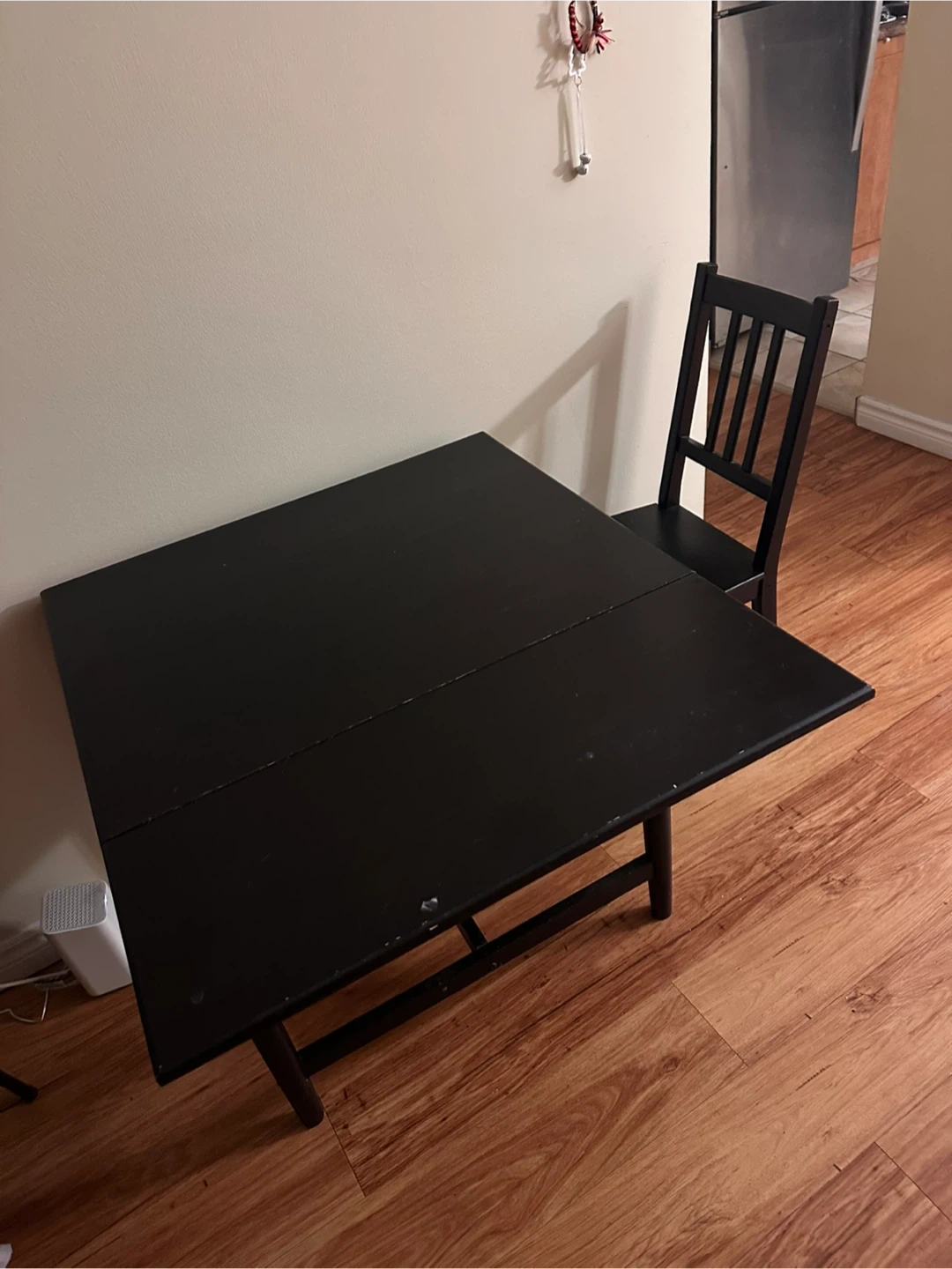 This black drop-leaf table and chair set is perfect for smaller spaces. It's made of wood and offers a convenient dining or workspace solution. The table's sides can be folded down to save room when not in use.