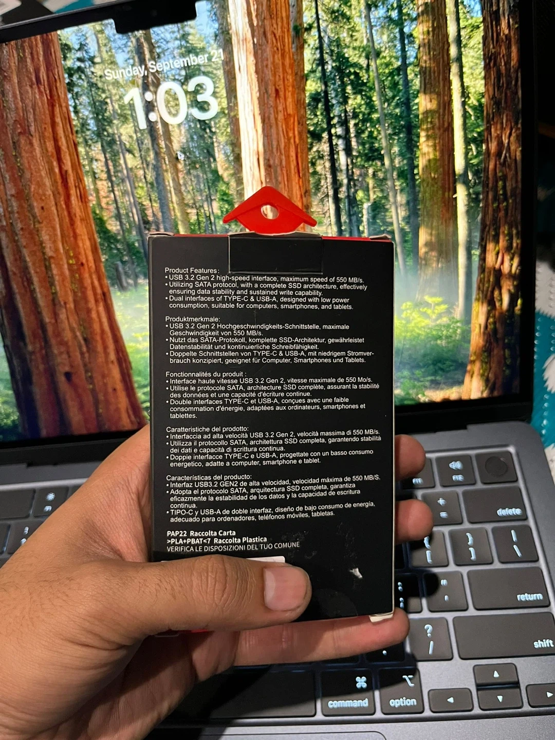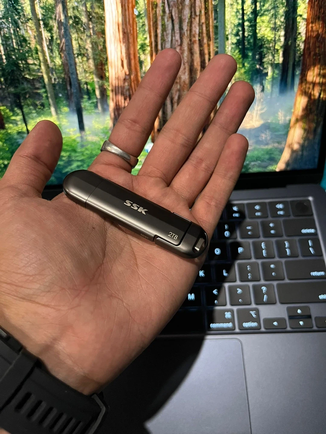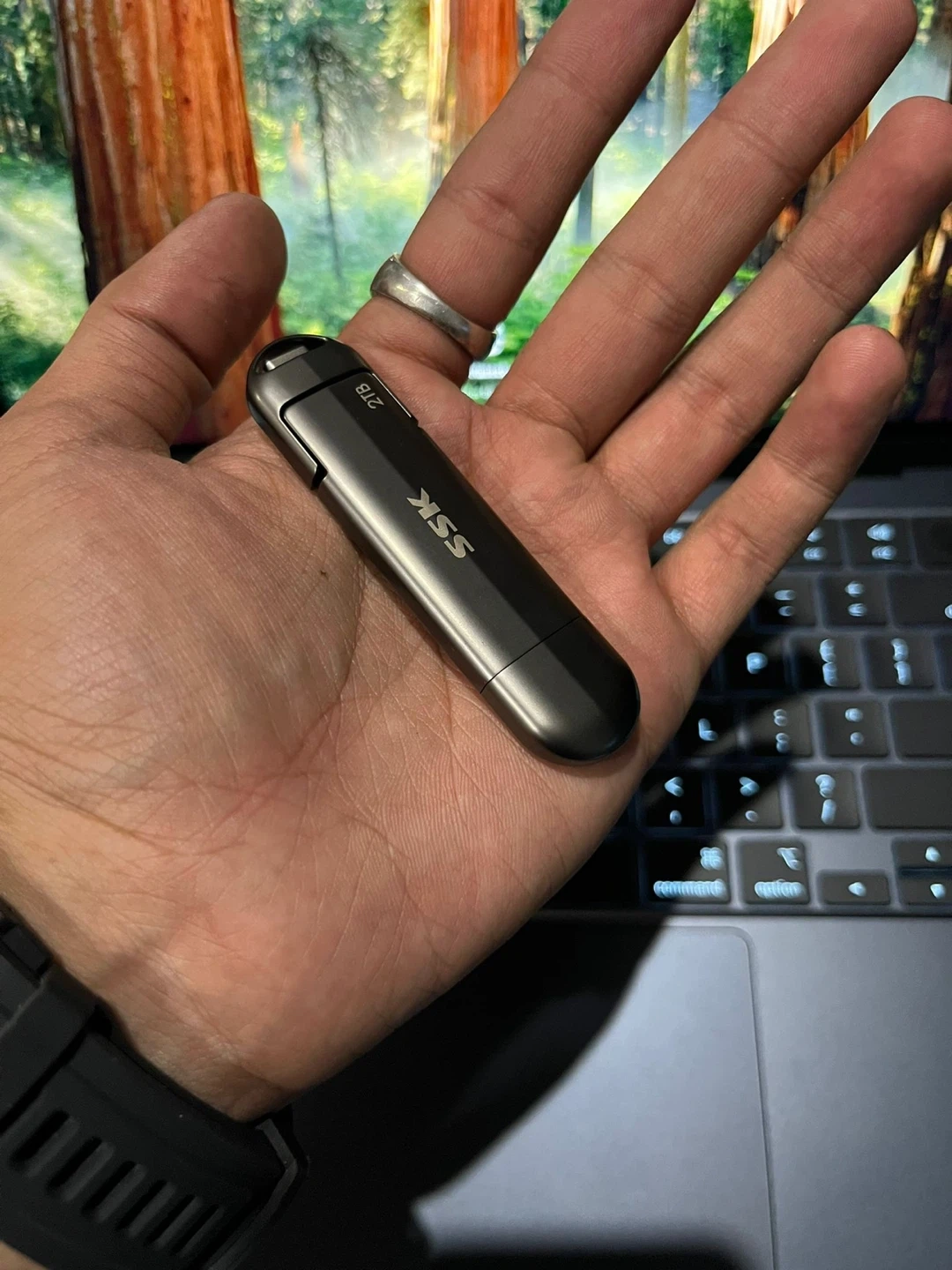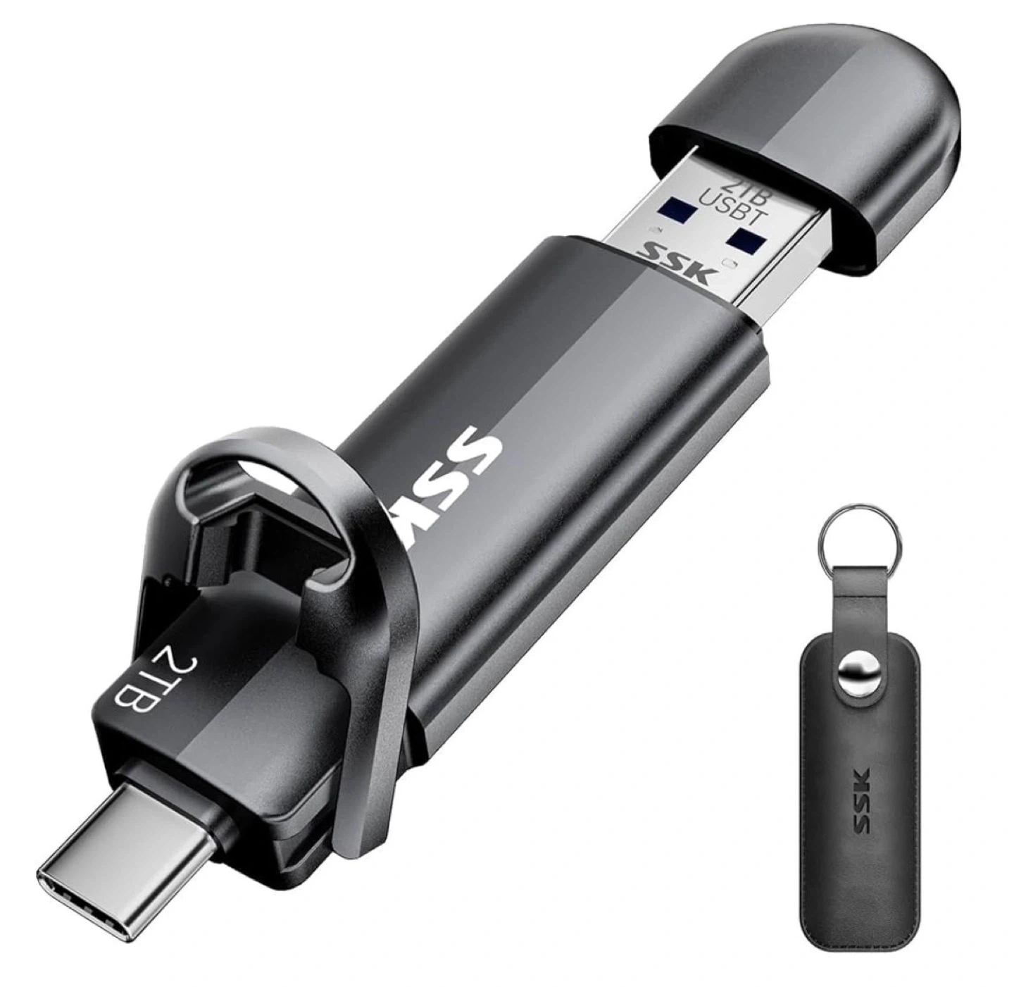 SSK 2TB SSD flash drive with USB 3.2 Gen 2. Utilizes SATA protocol and offers high-speed read/write up to 550 MB/s. It has dual interfaces of USB-C & USB-A for versatile compatibility. This drive is great for transferring large files quickly!