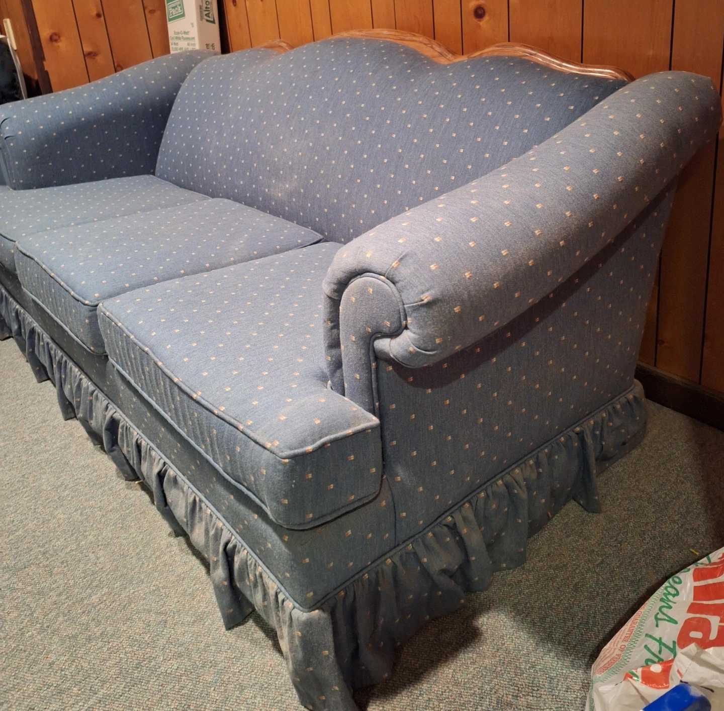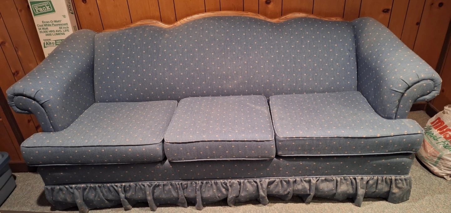 Sofa. Denim Blue color. Oak Wood Trim Accent along the back.