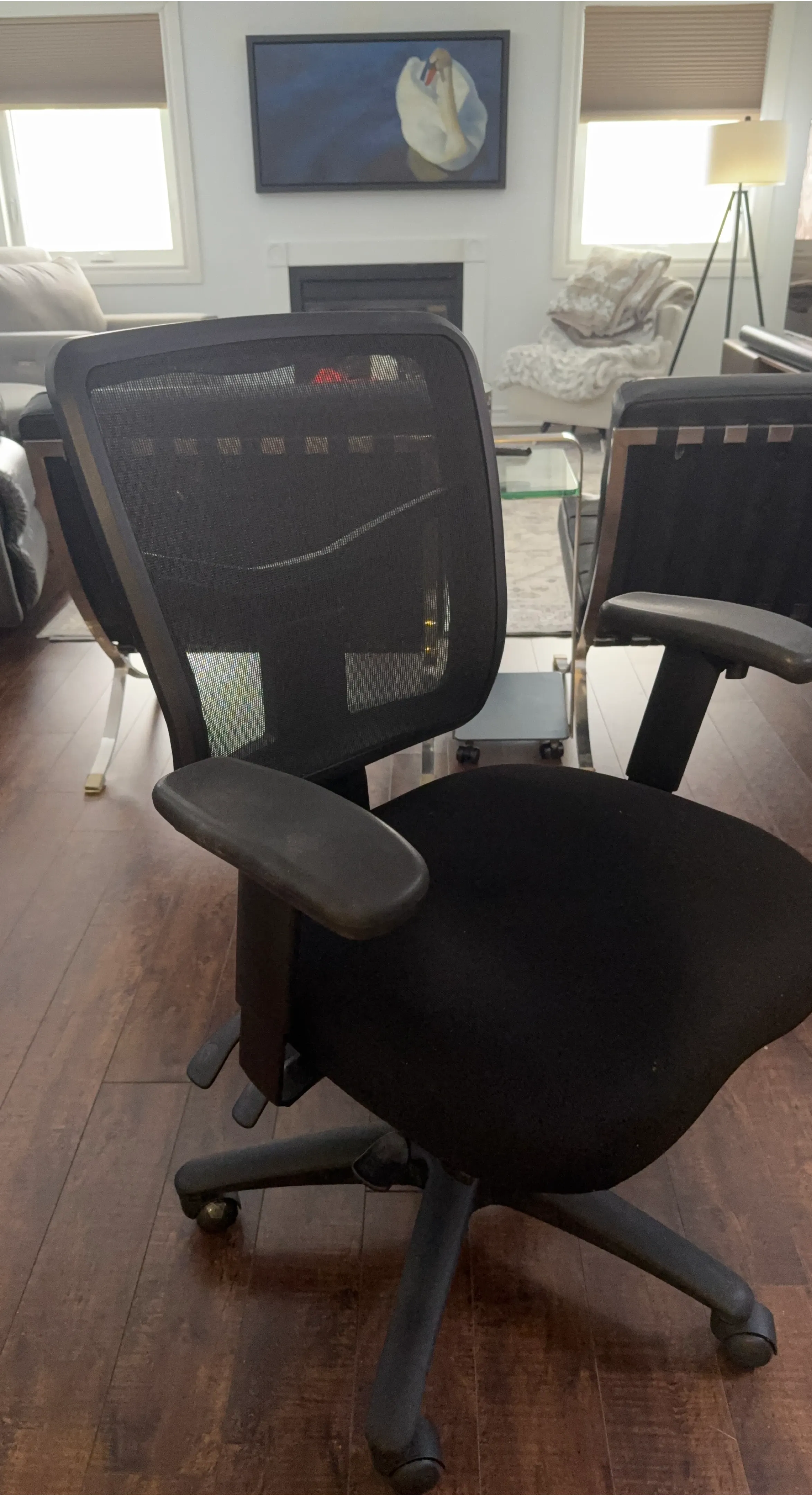 This is a black mesh back office chair with padded seat and adjustable armrests. It's designed for comfortable seating. The chair features a five-star base with casters for easy mobility. It's suitable for home offices or professional workspaces.