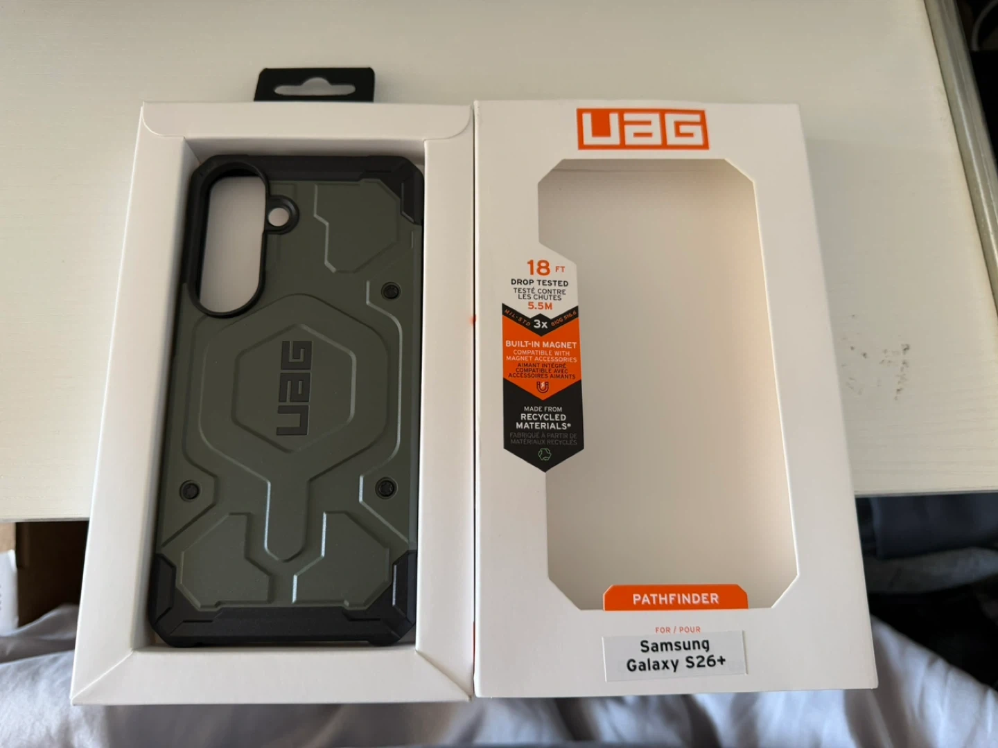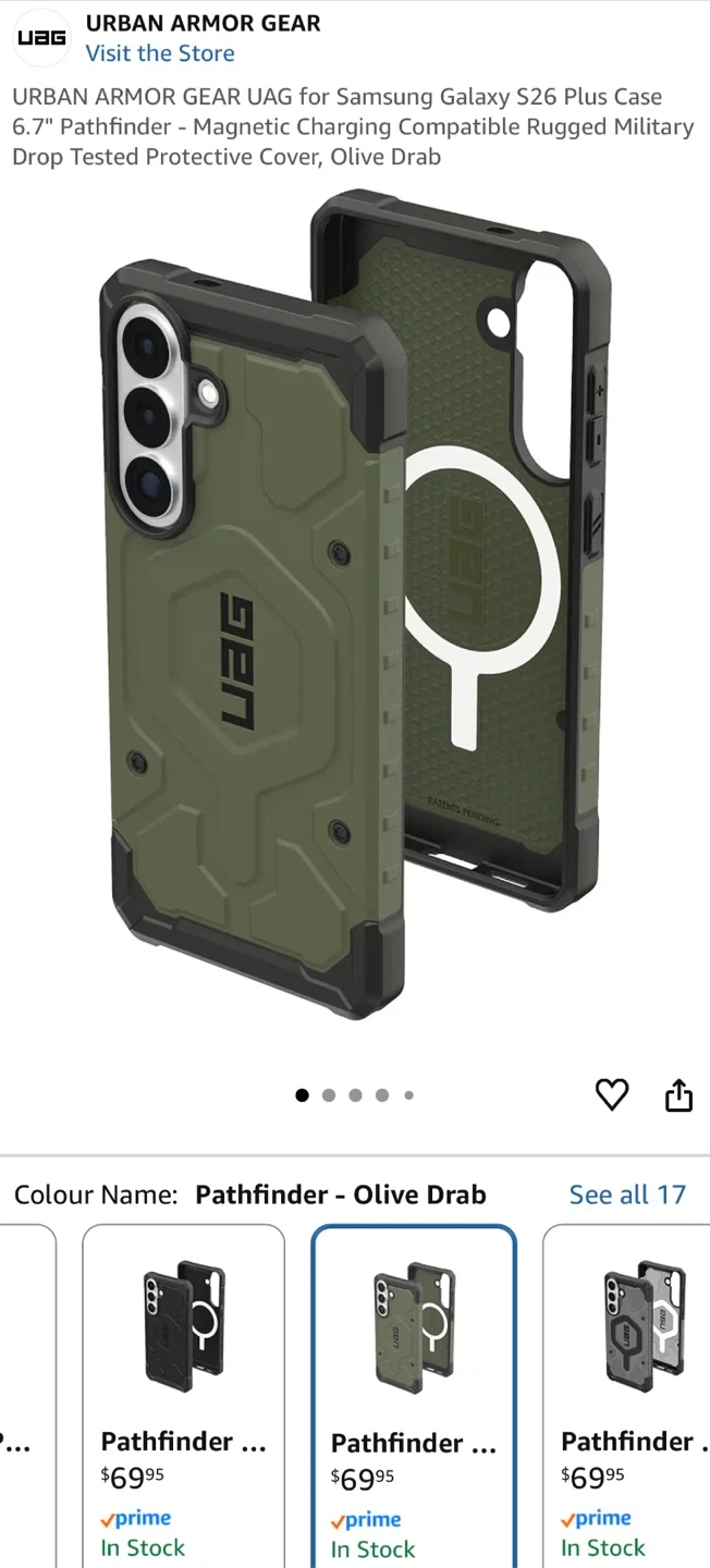 This is a UAG Pathfinder case for a Samsung Galaxy S26+. It's a rugged, military-grade protective cover in Olive Drab. It's compatible with magnetic charging.
