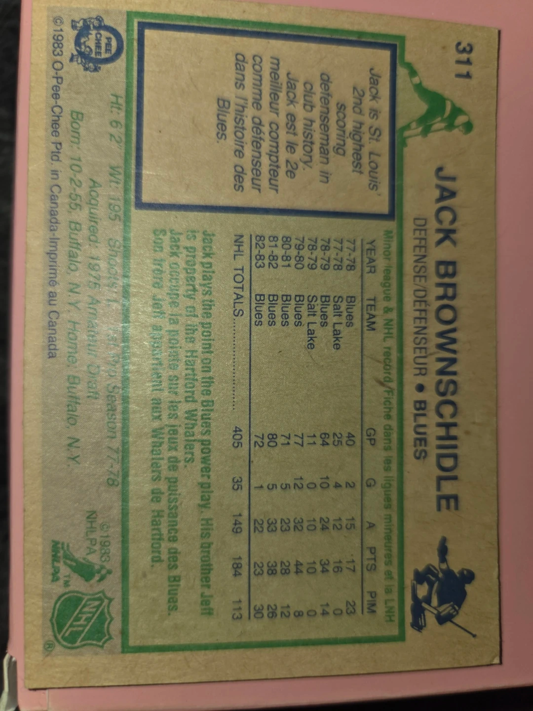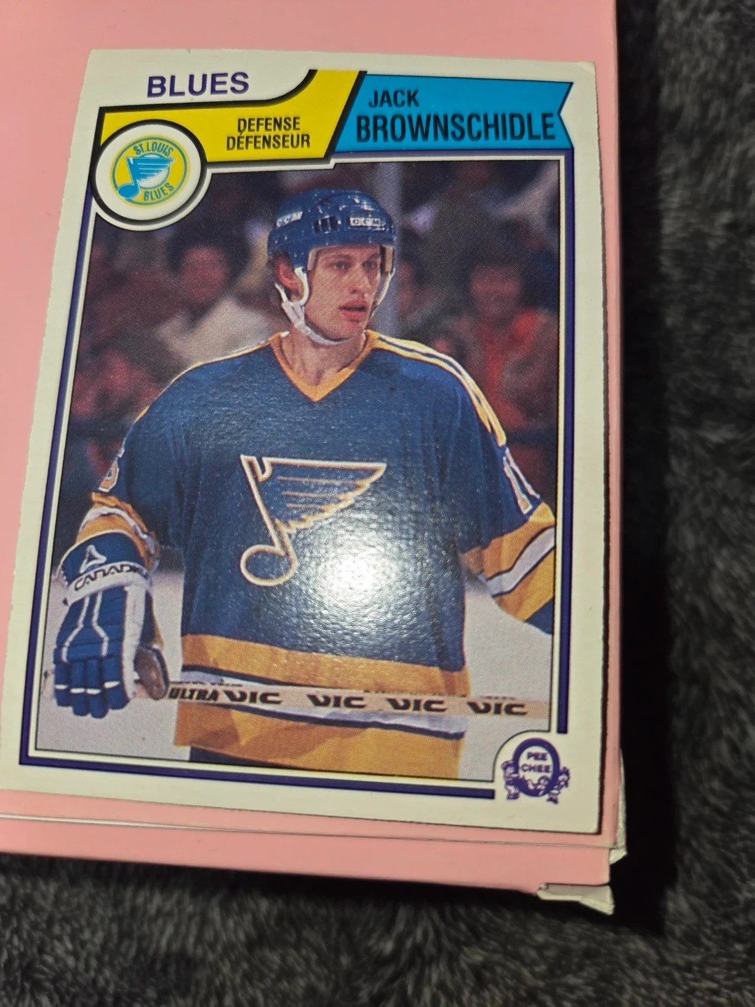 This is a 1983 O-Pee-Chee hockey card featuring Jack Brownschidle of the St. Louis Blues. It's a valuable collectible for hockey fans. The card is in good condition for its age.