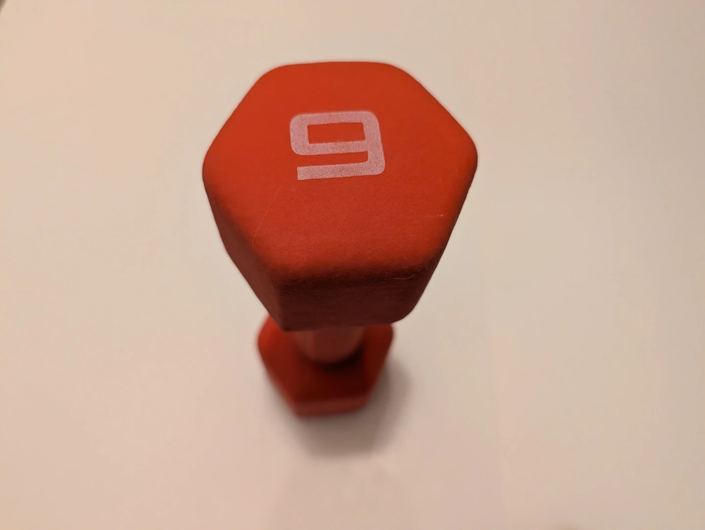To sell or trade: a single 9 pound red dumbbell with hexagonal heads. It has an iron core (ASTM A48 Grade 20) and is coated with 3mm neoprene to enhance grip and increase comfort. CAP brand.