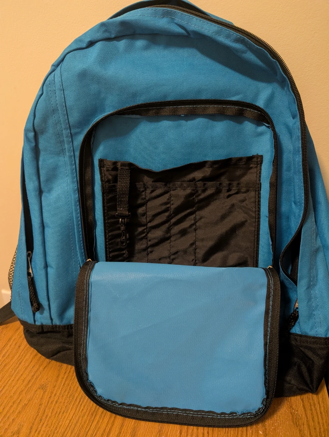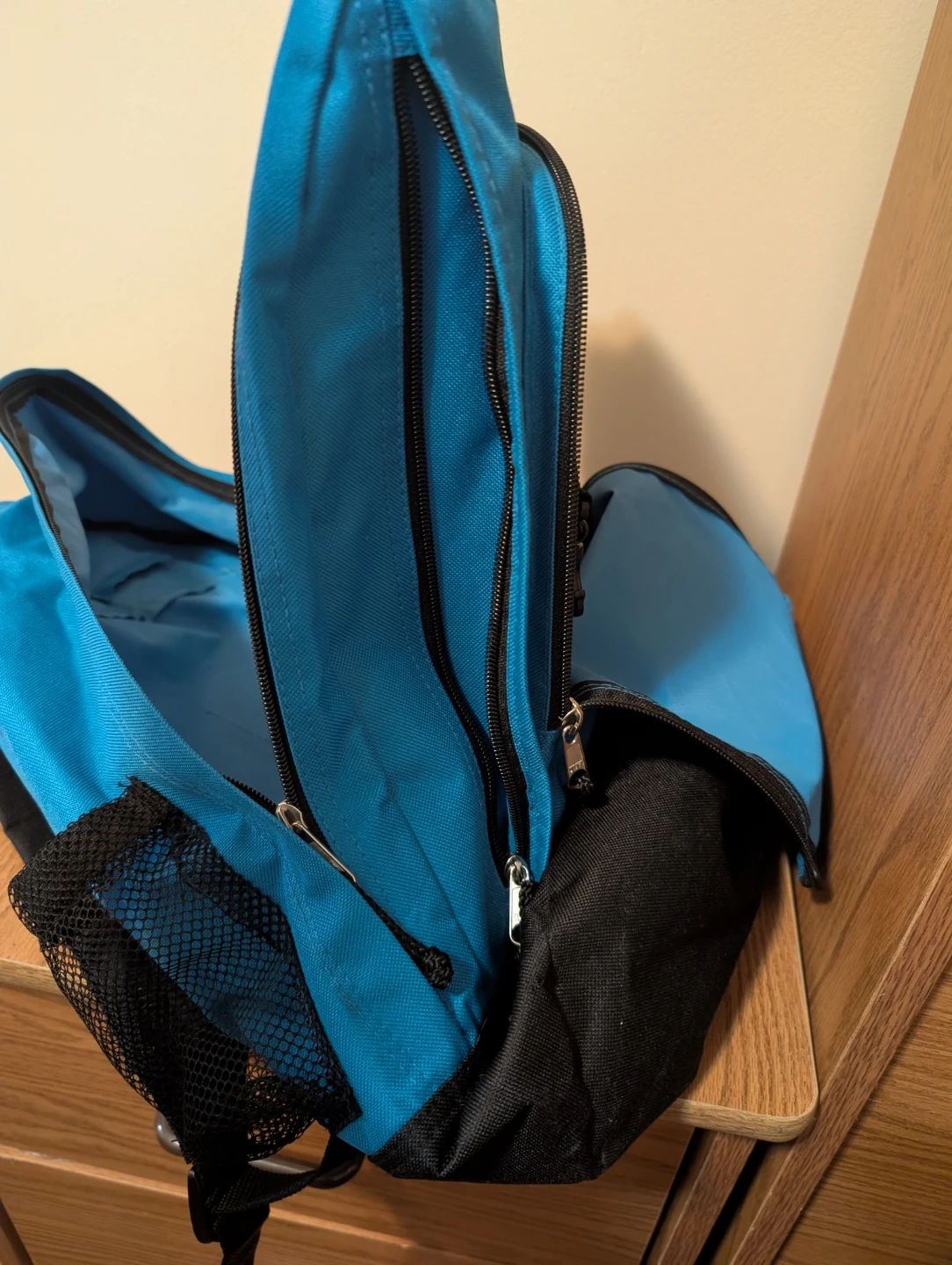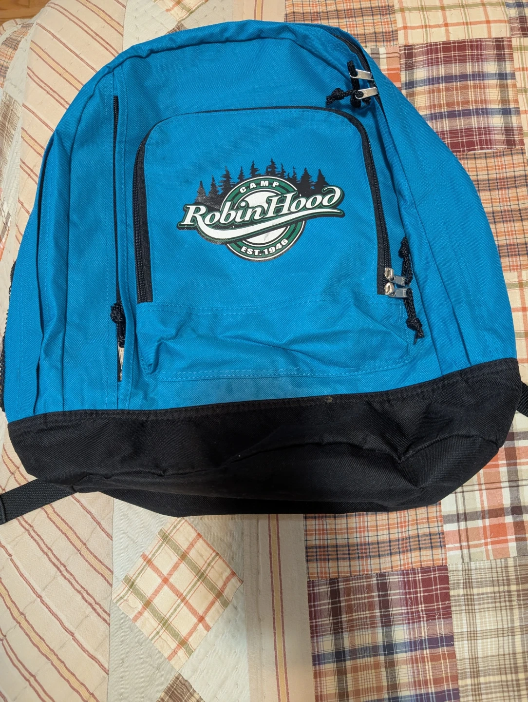 This is a blue backpack with the Camp Robin Hood logo on the front. It features multiple zippered compartments and side mesh pockets. It's great for carrying your essentials for a day out or for camp!