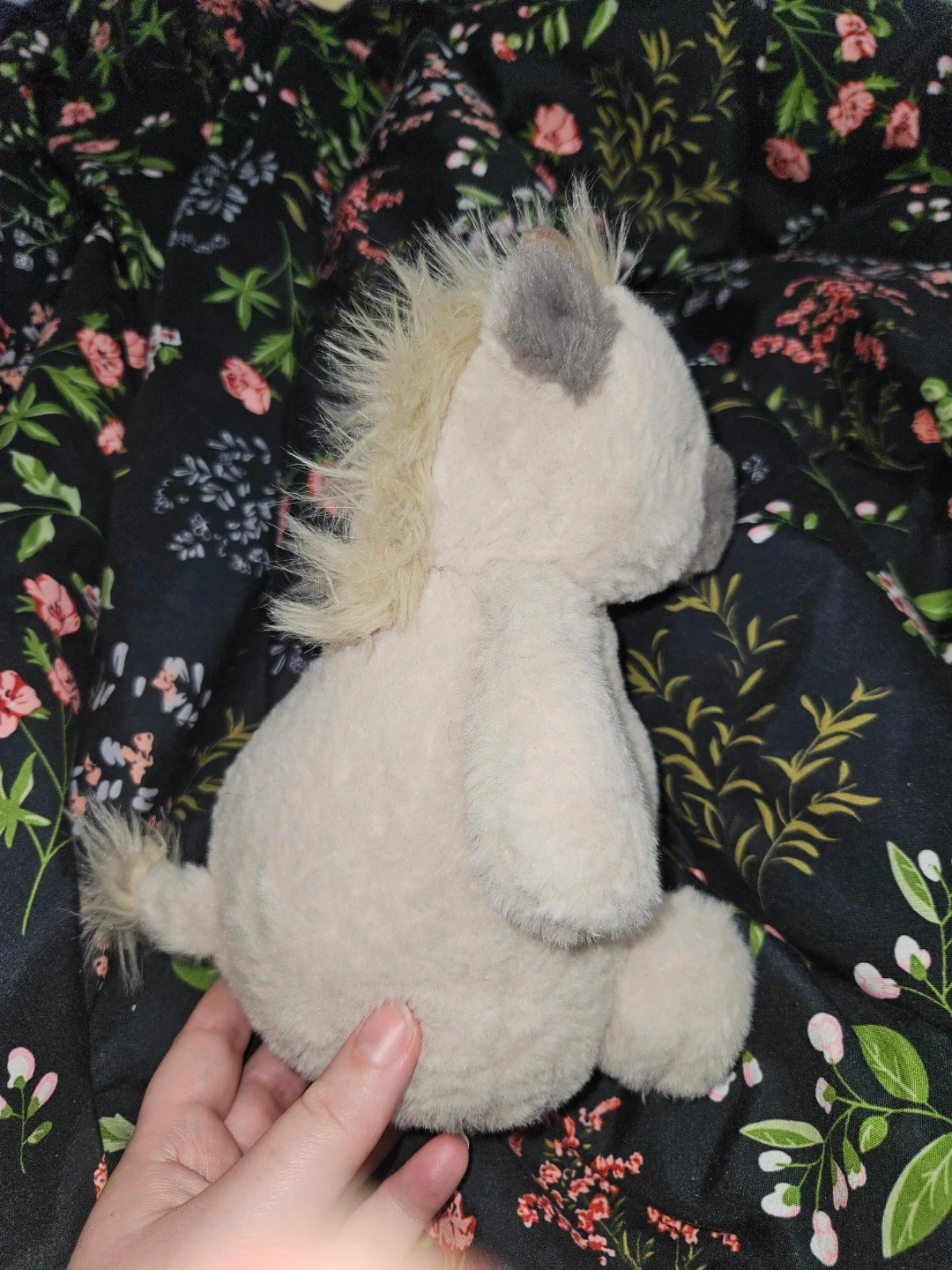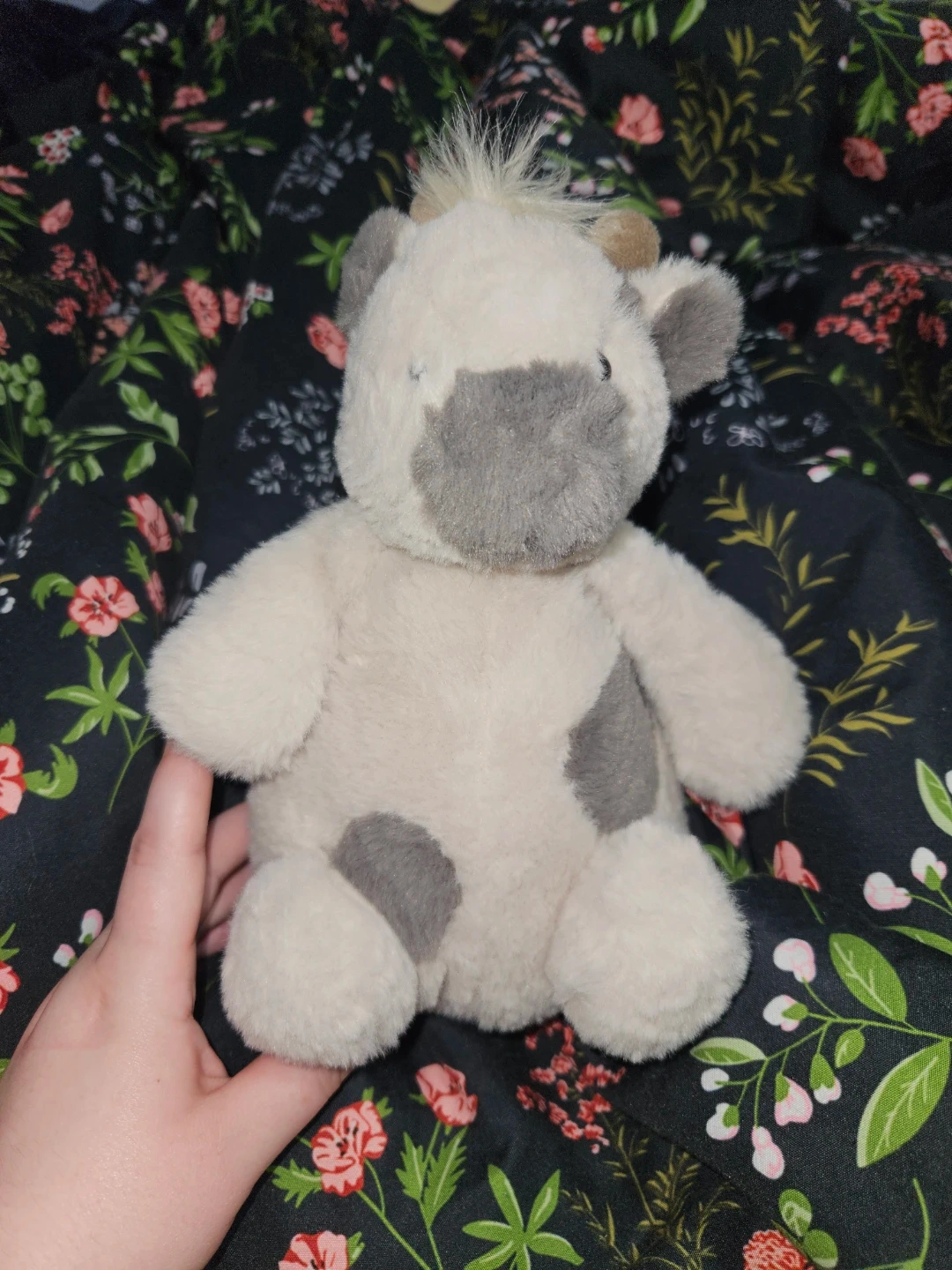 This is a soft, plush cow toy. It's a cream colour with grey spots. Its mane and tail are a lighter blonde colour. This plush animal is a great companion for kids!