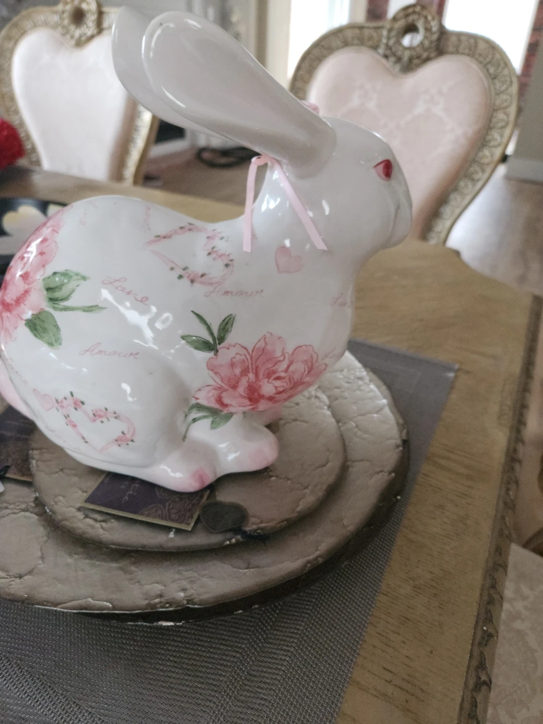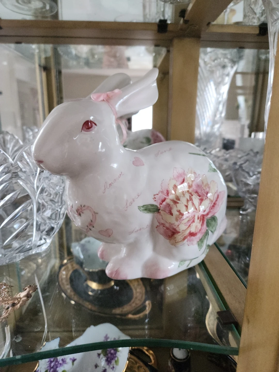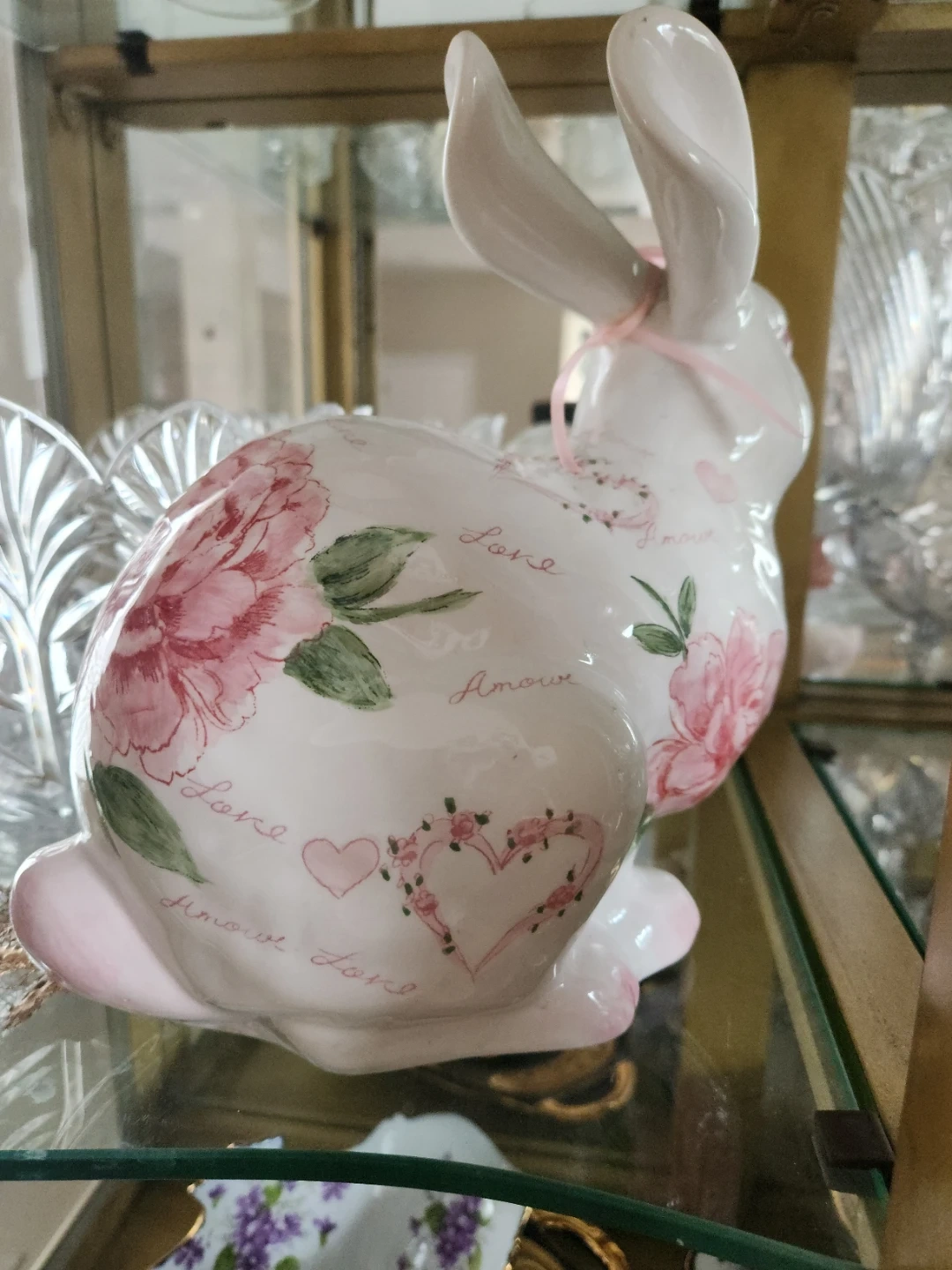 White ceramic bunny figurine adorned with floral and heart designs. This charming piece adds a touch of spring to any decor. It's perfect for display on a shelf or table.