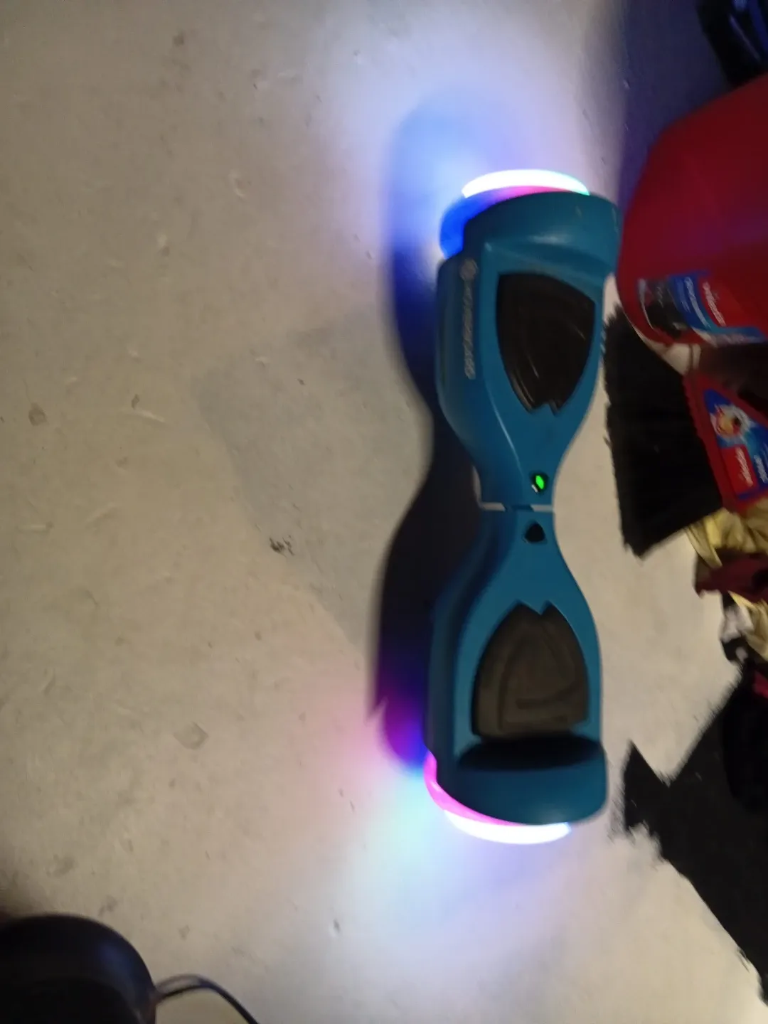 This blue hoverboard lights up with colourful LEDs on the wheels. It's great for getting around and a lot of fun! The unit has a green indicator light and two footpads.