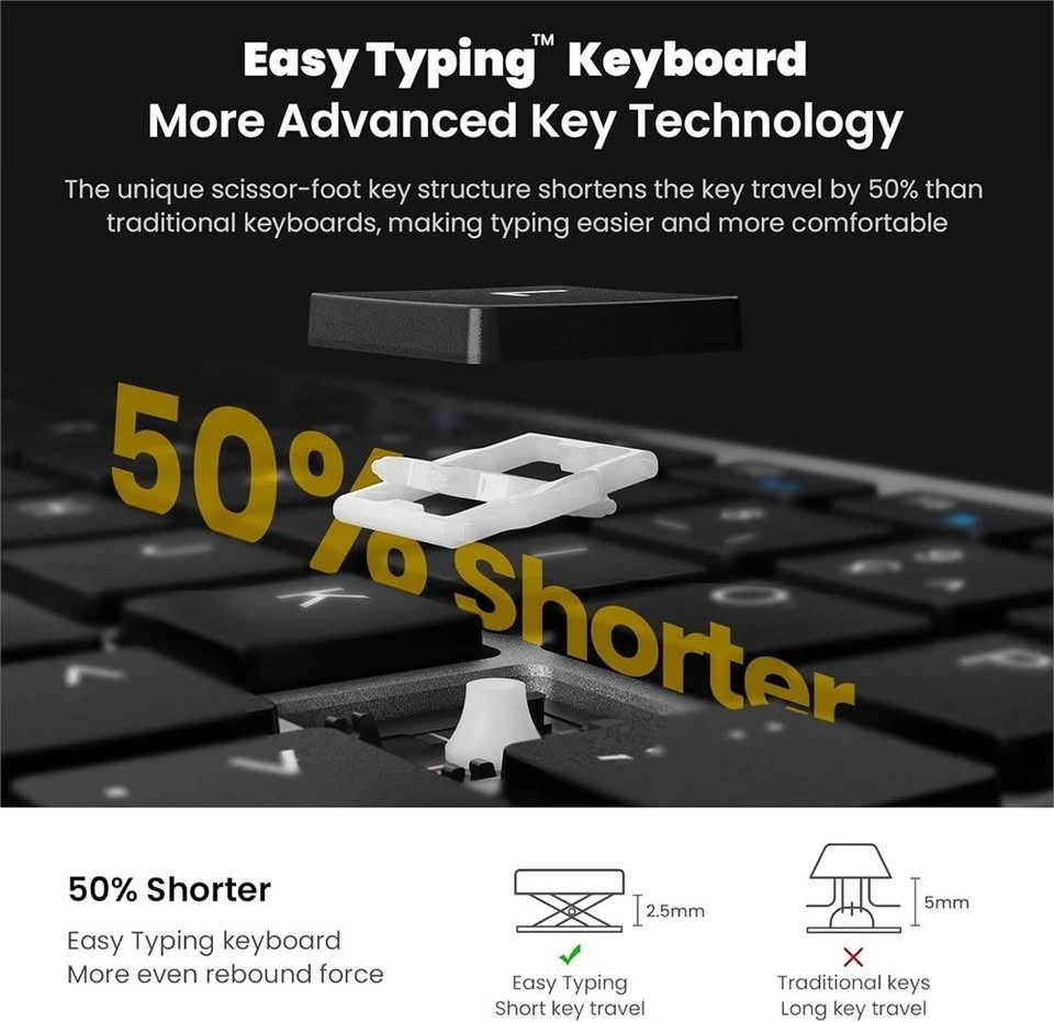 Slim and Ergonomic Design. The slim keyboard has a tilt angle for a great typing position. Sweat-resistant, skin-friendly finish wireless mouse in contoured shape would provide hours of work comfortably. The full size keyboard types fast with a numeric keypad and instant access to your music, internet, e-mail, volume, etc by multi-media hot keys (The hot-keys are not fully compatible with Mac System). The keyboard's noise reduced keys and the silent click of the quiet mice will allow you to do your job without missing a sound or disturbing your environment.