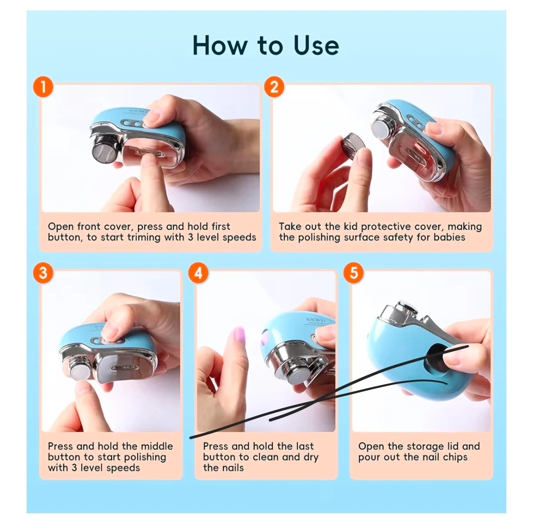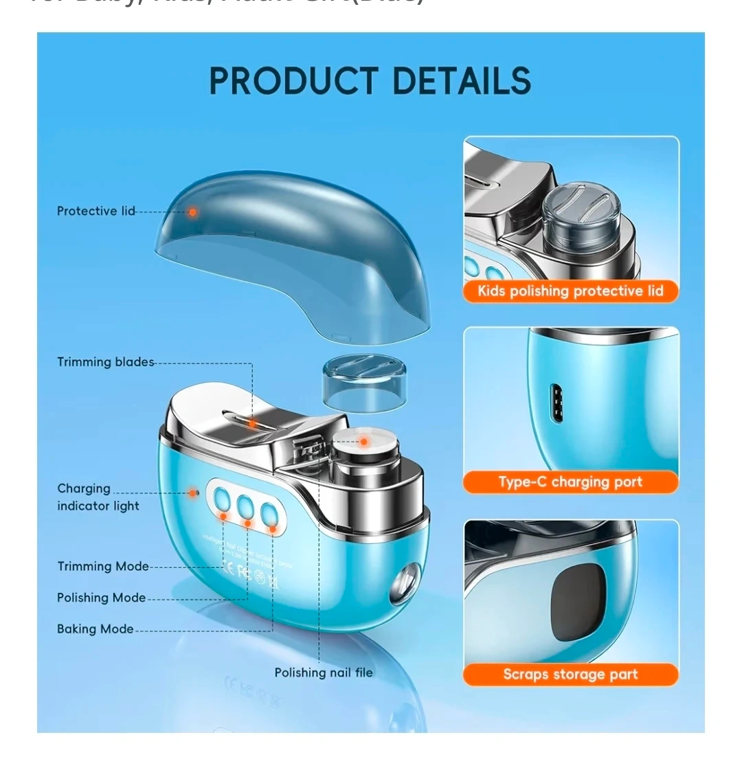 This electric nail grinder is designed for smart pruning and soft hand protection. It features integrated cutting and grinding with a 360° omnidirectional cutting mode. It has a 500mAh built-in rechargeable lithium battery offering 8 hours of working time. Includes a Type-C charging port.