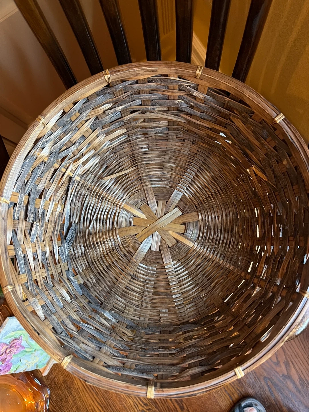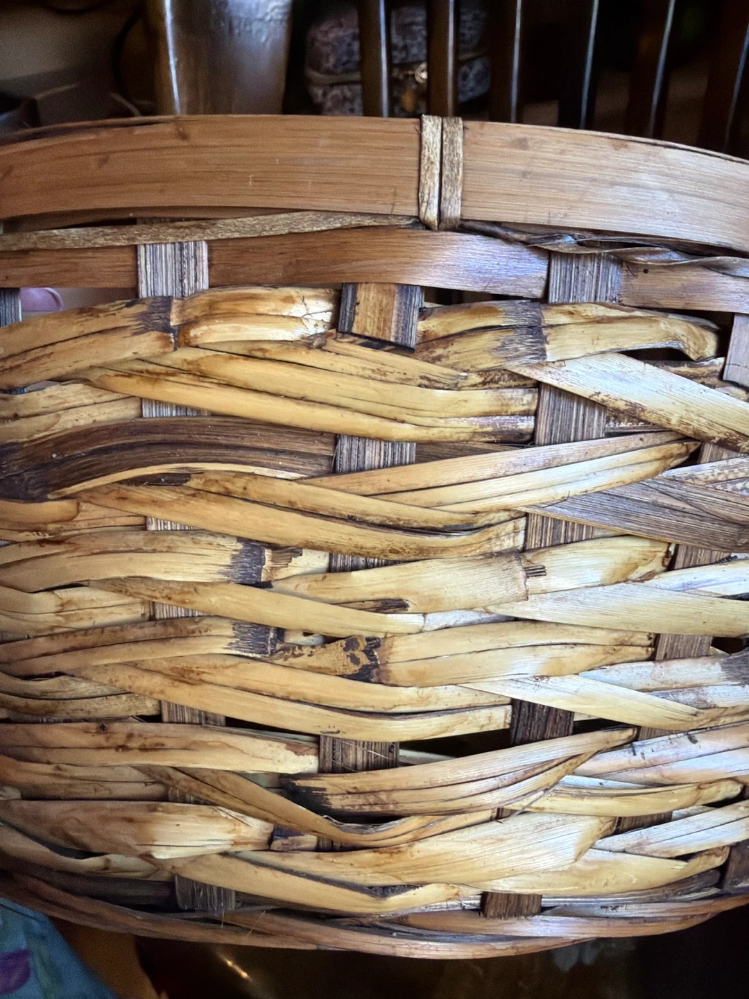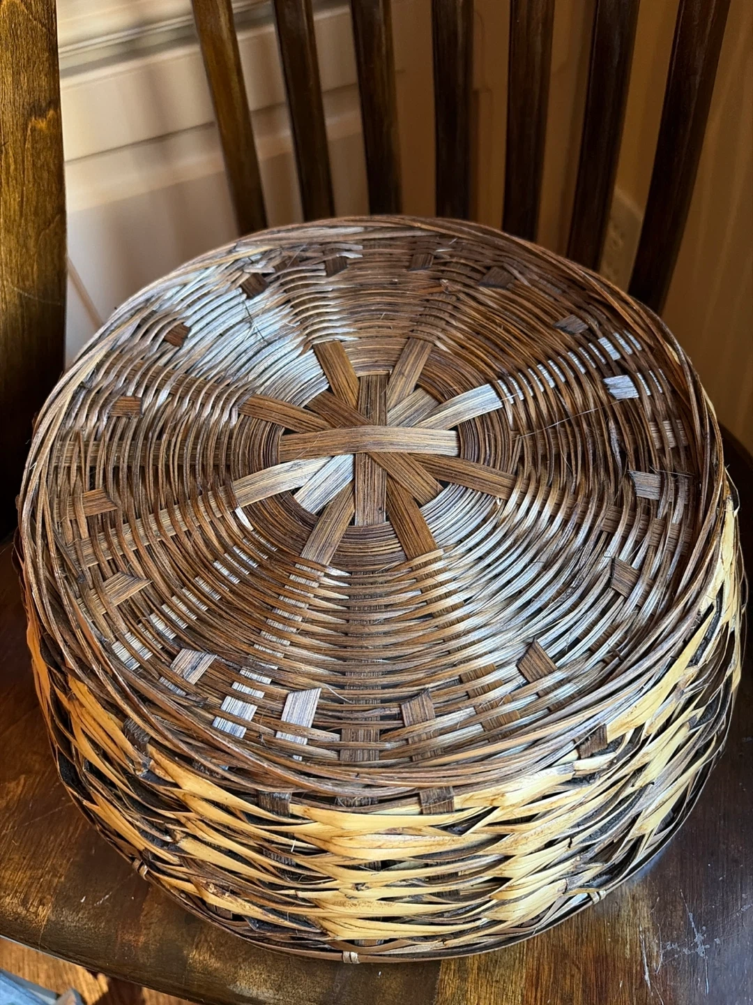 Hand-woven round basket made from wicker and maybe bamboo. Very nice details with different tones of brown within the basket. It's a versatile piece for storage or decor. Dimensions are approximately 13 inches in diameter and 5 inches high. Adds beautiful texture to a room or a shelf.