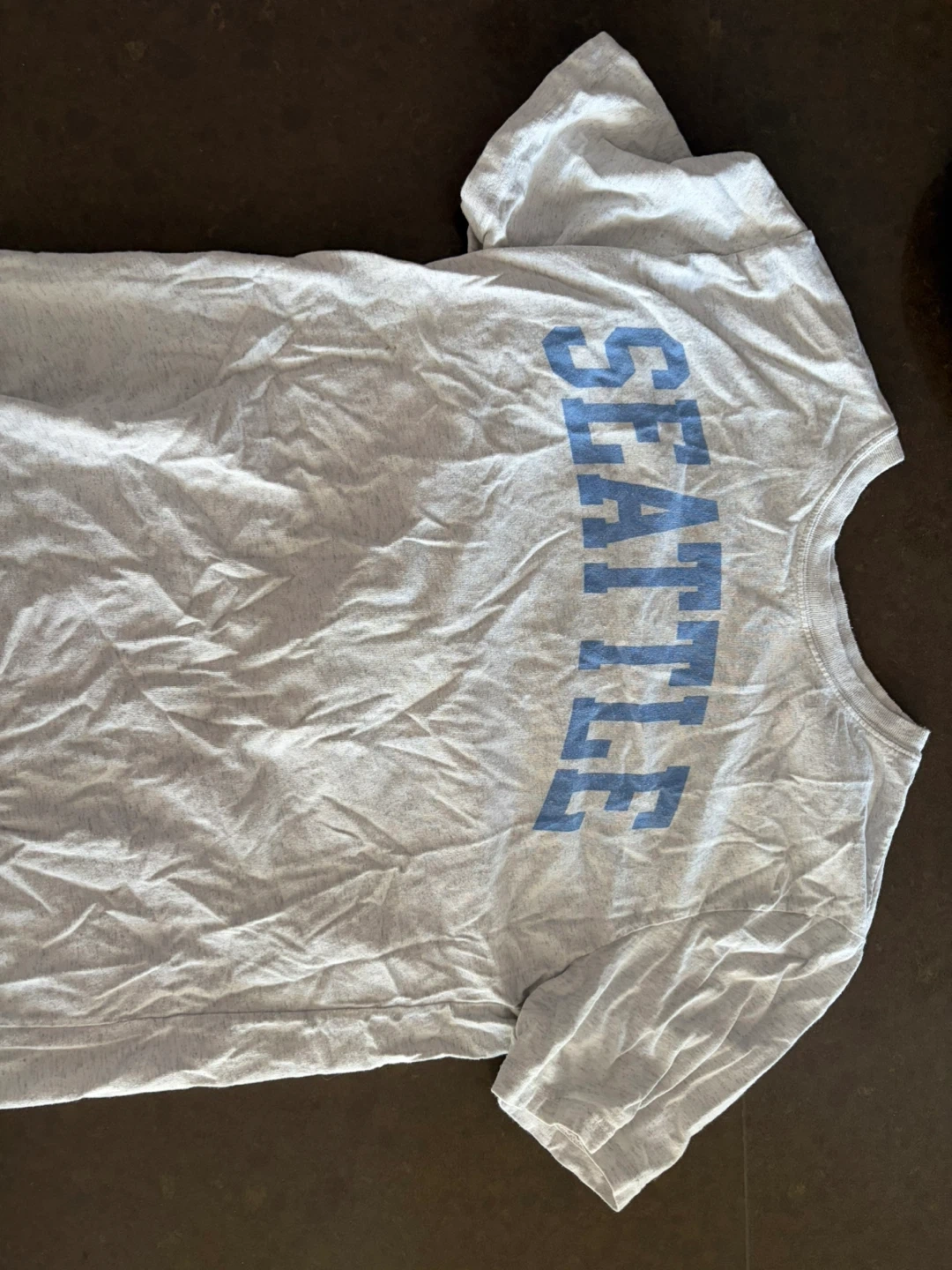 Light grey t-shirt with blue 'SEATTLE' text across the chest. It's a comfortable tee, likely made from a cotton blend.