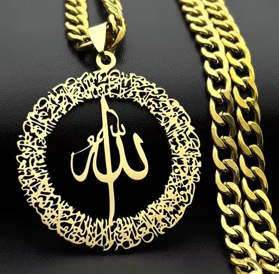 This is a gold-tone necklace featuring a circular pendant with Arabic calligraphy spelling 'Allah'. It comes with a thick curb chain. It's great for everyday wear or as a gift.