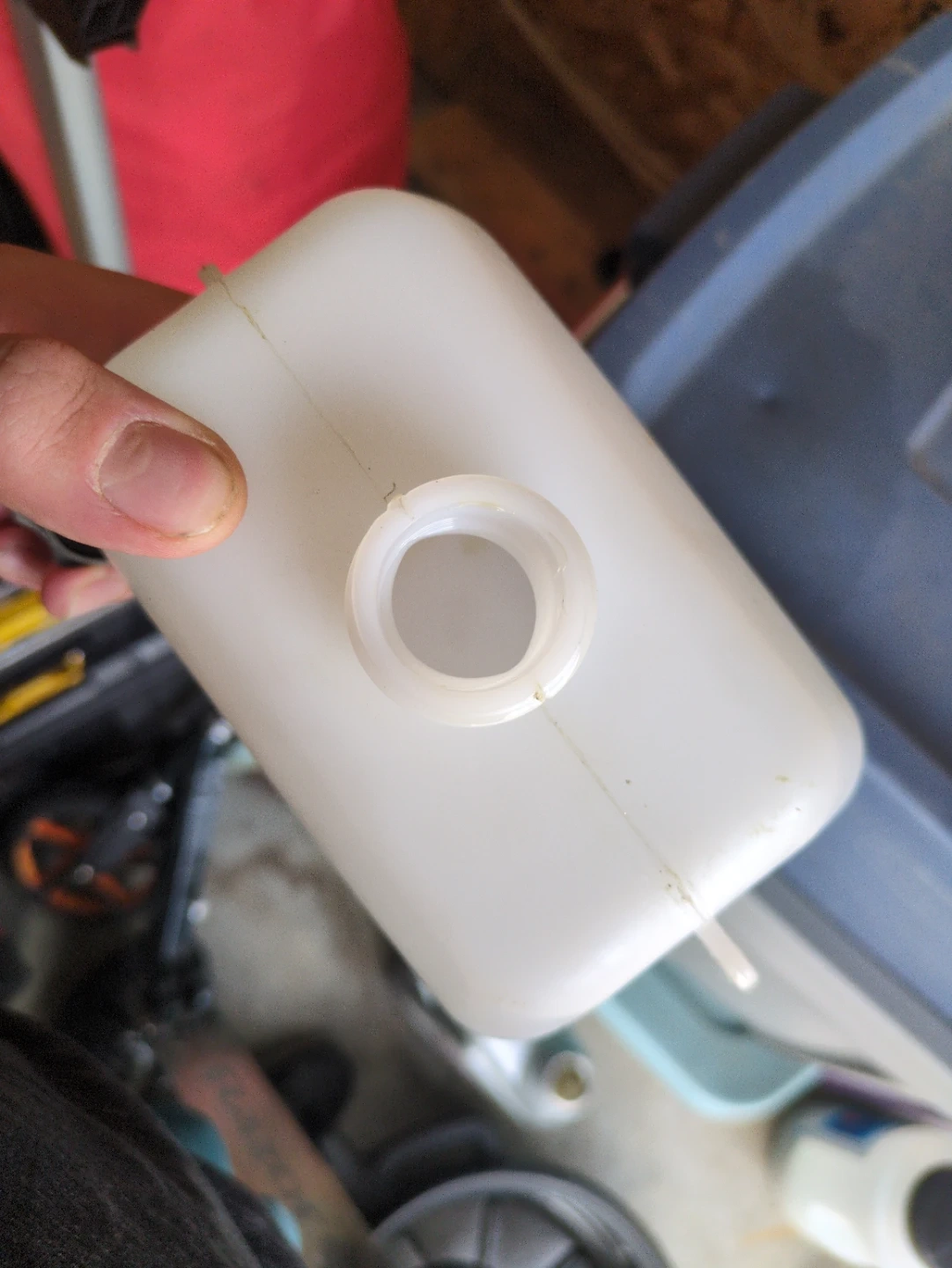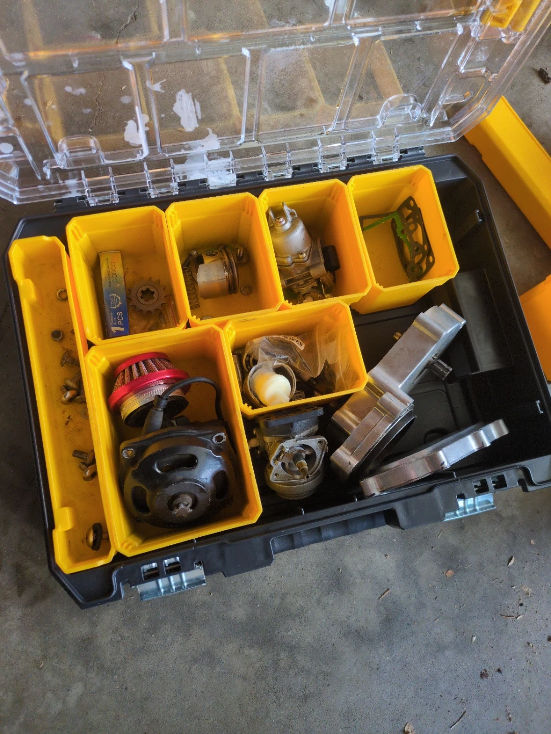 This is a mini dirt bike with a silver frame and yellow wheels. It features a small engine and suspension. Great for recreational use on appropriate terrain. Extra parts are also included. The only thing missing is a small piece that holds the throttle needle down and that's about it. Box that holds parts and cubbies included. Fairly new fuel tank also included.