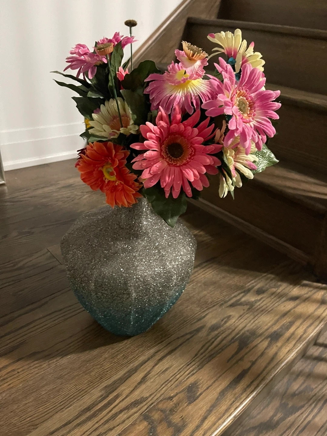 Here's a lovely decorative vase that would look great in any room! It features a gradient from silver to blue and has a textured, glittery finish. Perfect for displaying flowers or as a standalone piece