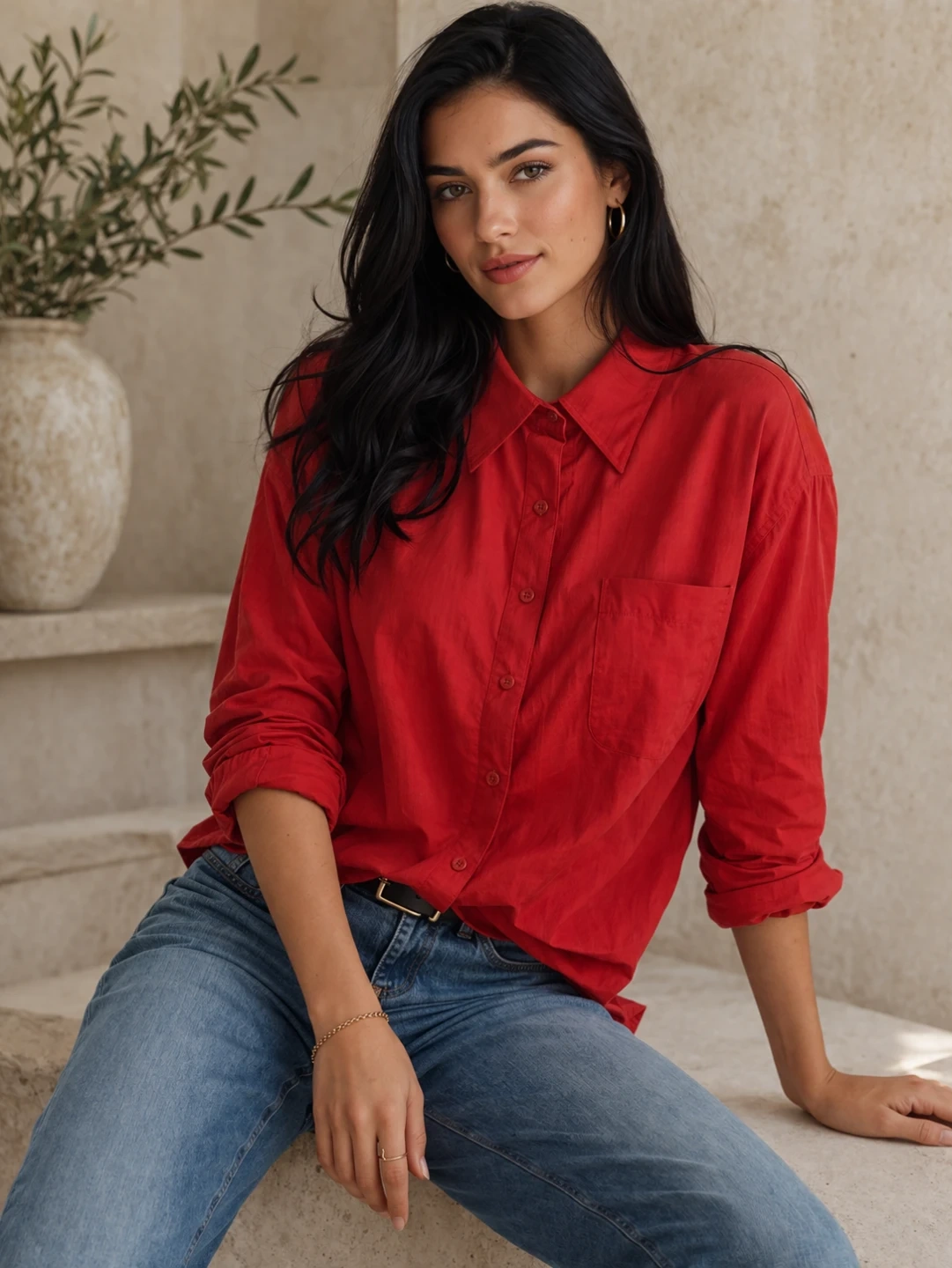 Classic red button-up shirt with a chest pocket. Long sleeves. Made from a breathable material. It's a versatile piece for any wardrobe!