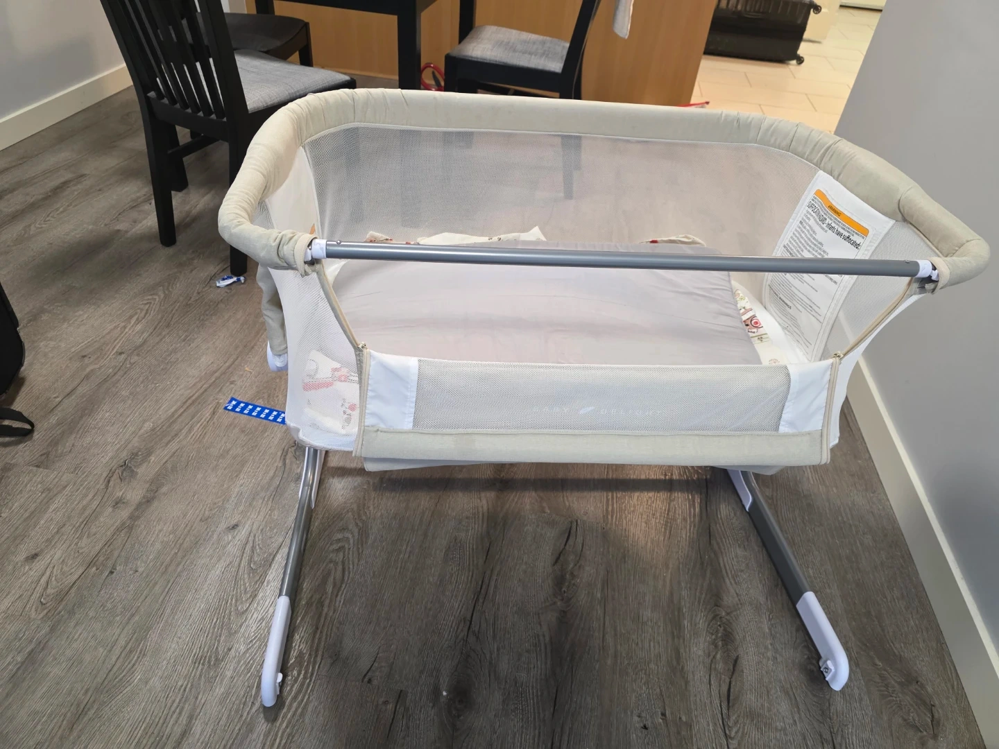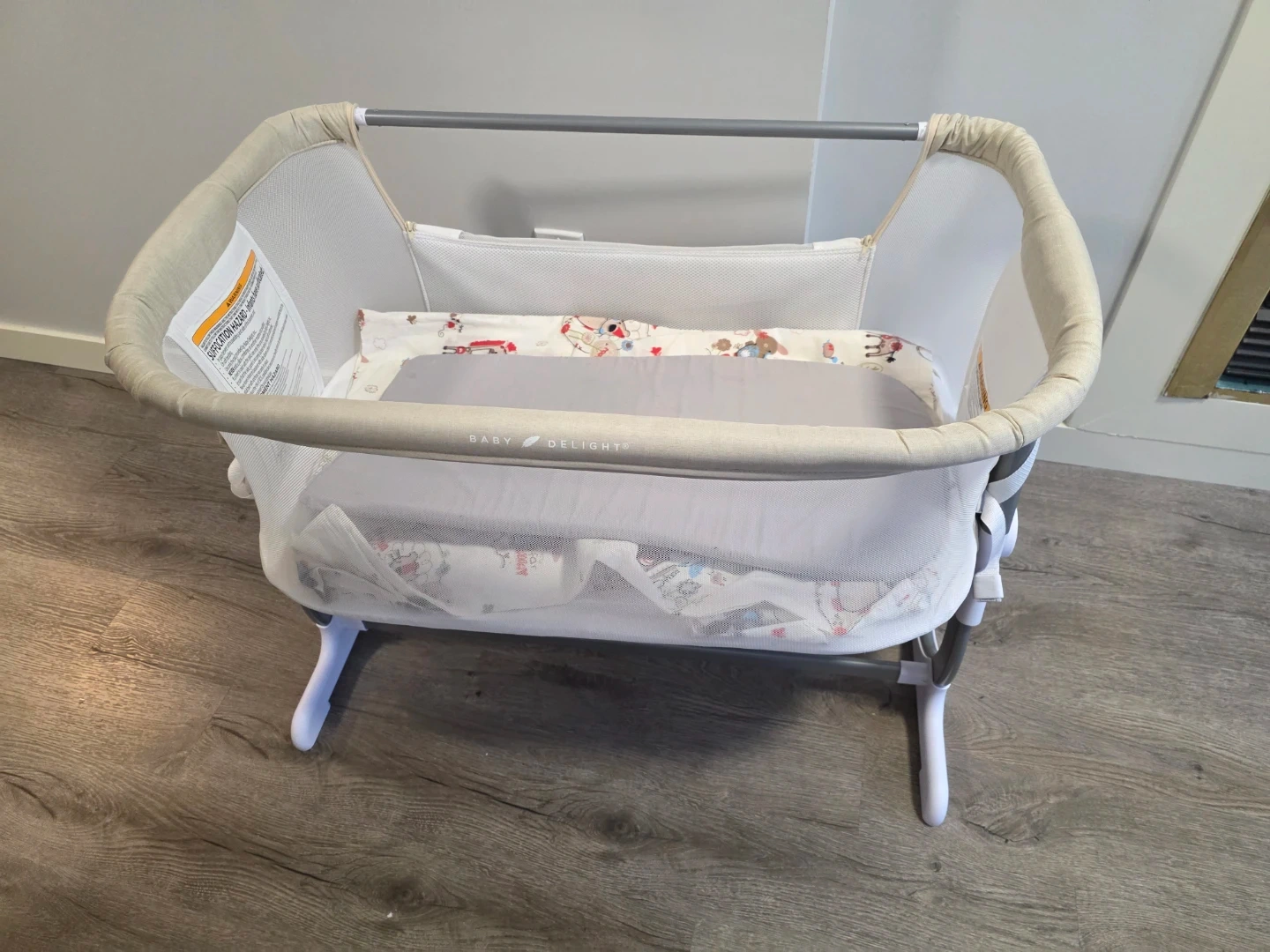 Selling a Baby Delight Beside Me portable bassinet. This bassinet is lightweight and great for travel. Features mesh sides for visibility and airflow. Comes with a fitted sheet. No smok no pet