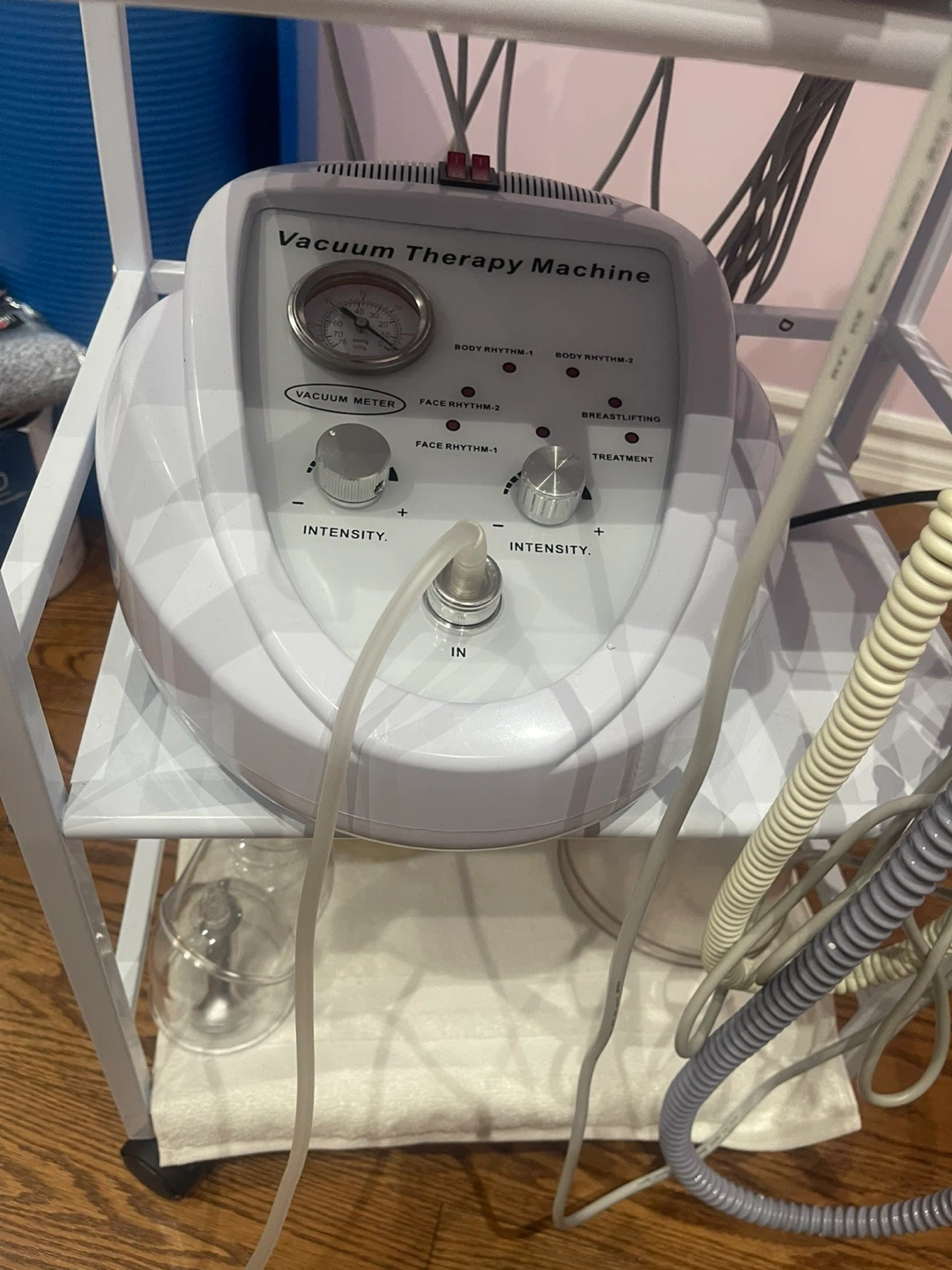 This vacuum therapy machine offers various rhythm settings for face and body treatments, including breast lifting. It features adjustable intensity controls and a vacuum meter for precise operation. Plastic cups accessory is included.