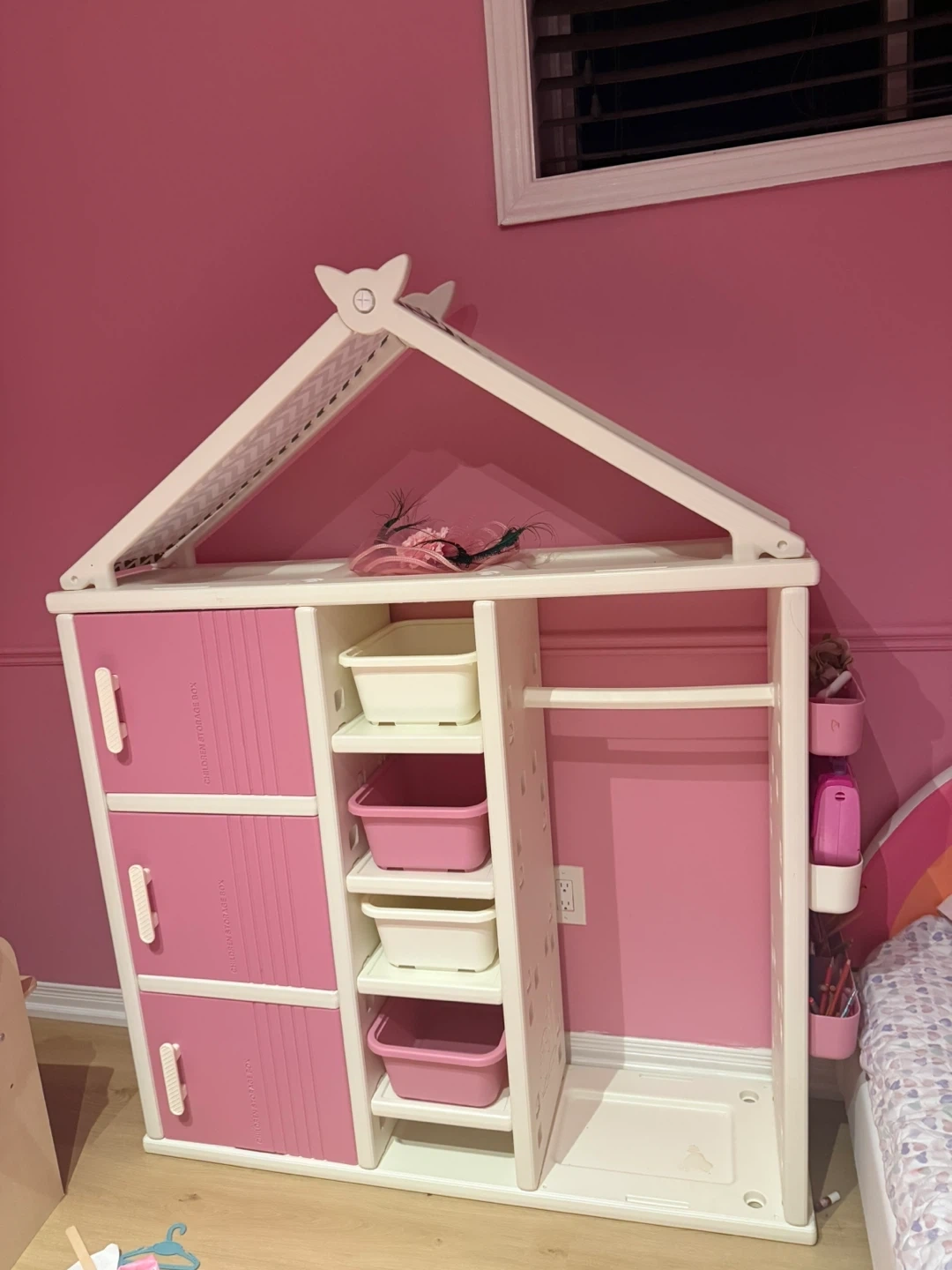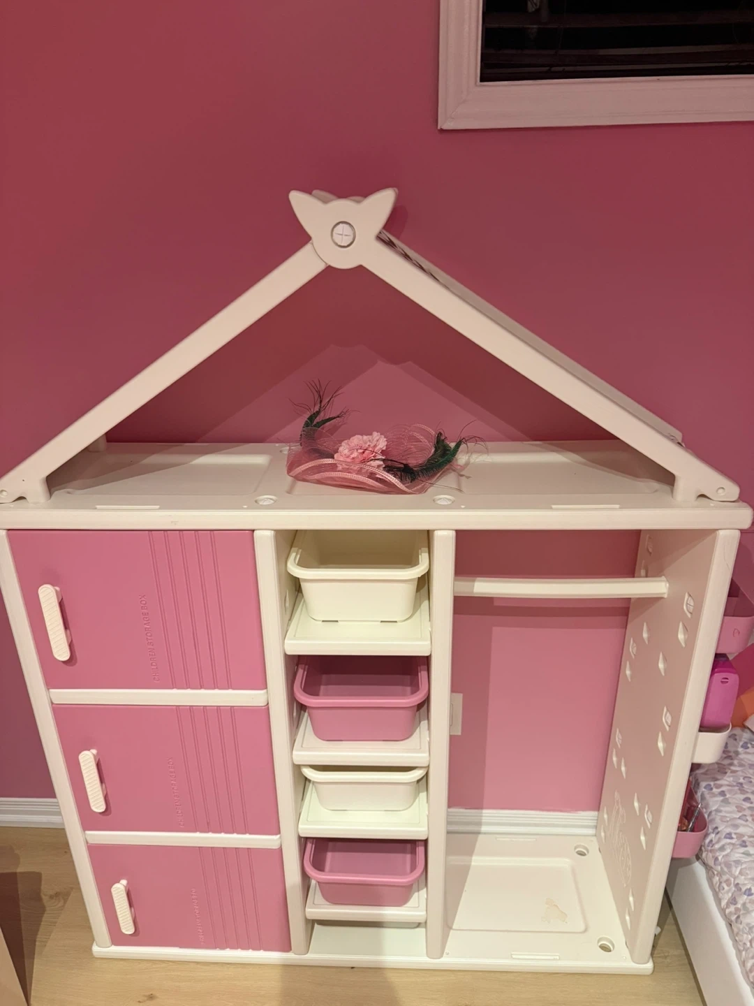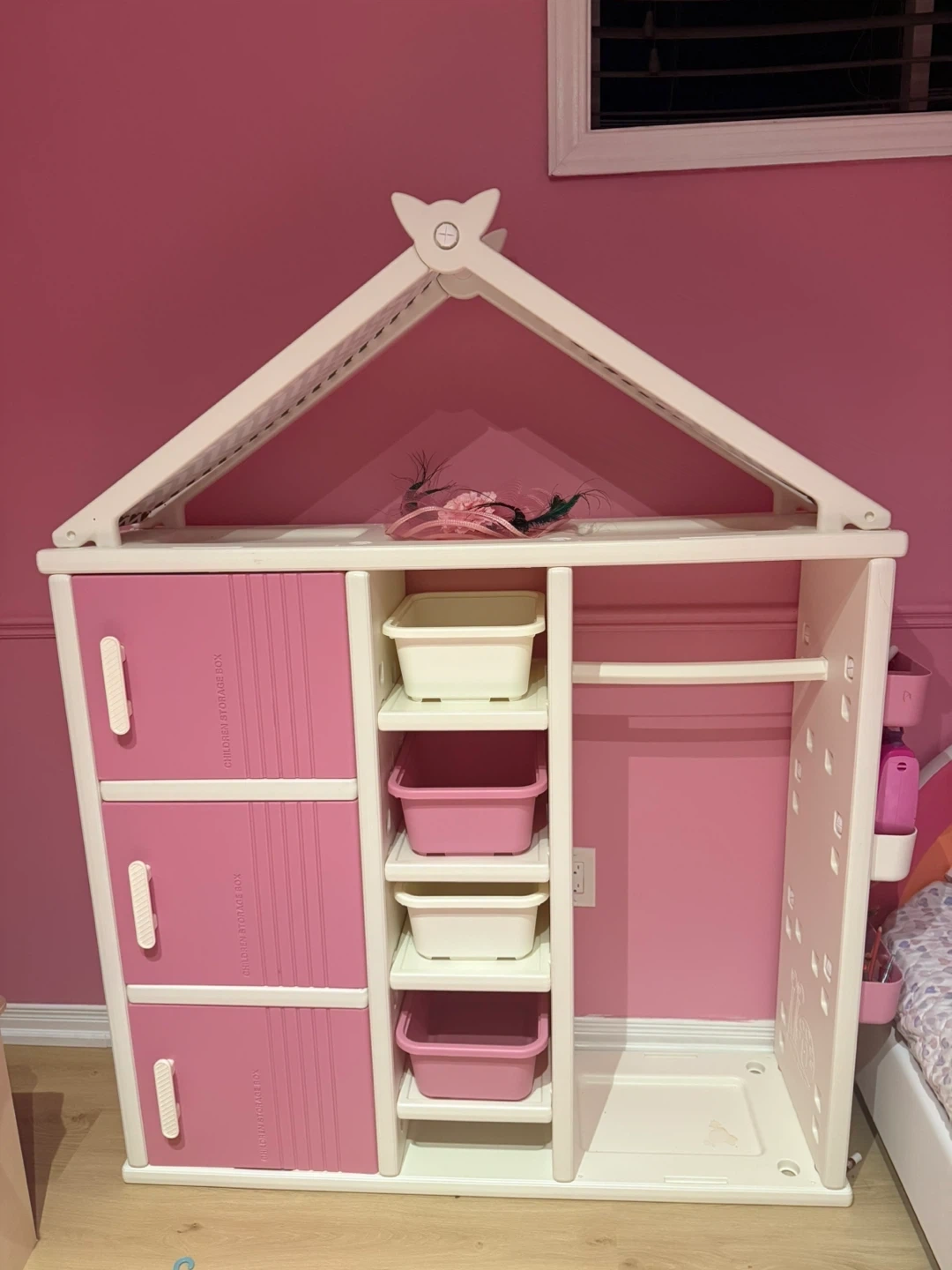 This is a white and pink plastic play wardrobe with three drawers and open shelving. It's designed to look like a small house, perfect for organizing children's toys or clothing. Includes multiple storage bins and a hanging rod.
