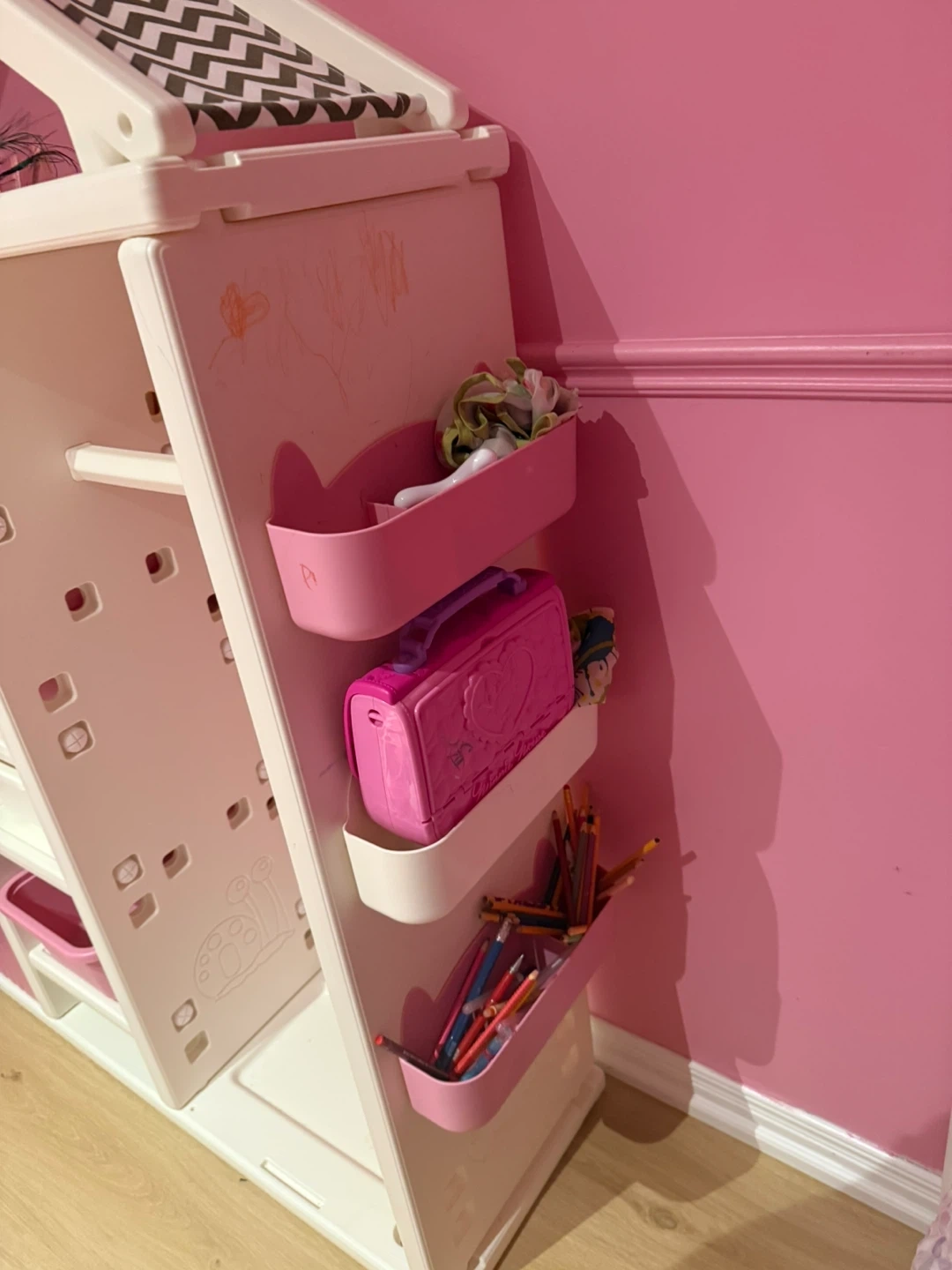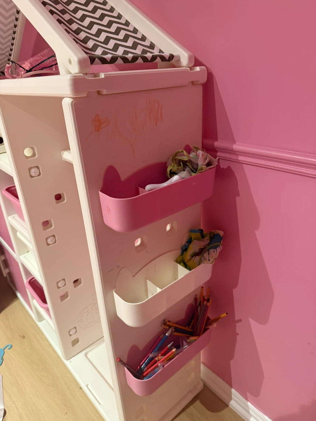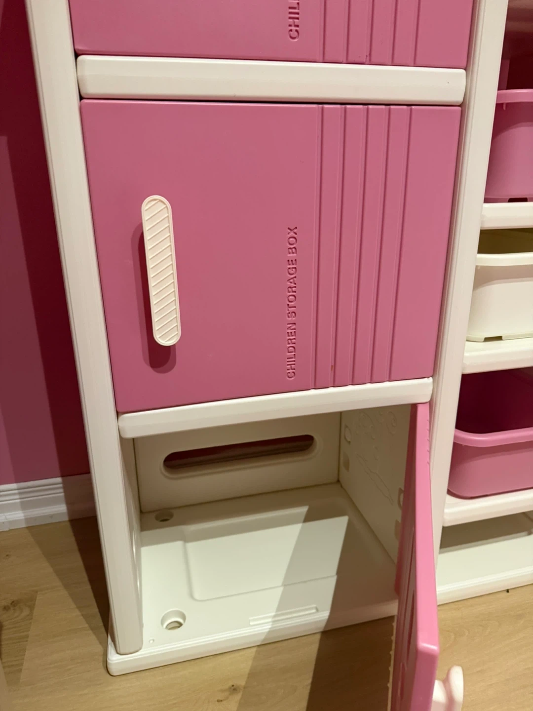 This is a white and pink plastic play wardrobe with three drawers and open shelving. It's designed to look like a small house, perfect for organizing children's toys or clothing. Includes multiple storage bins and a hanging rod.
