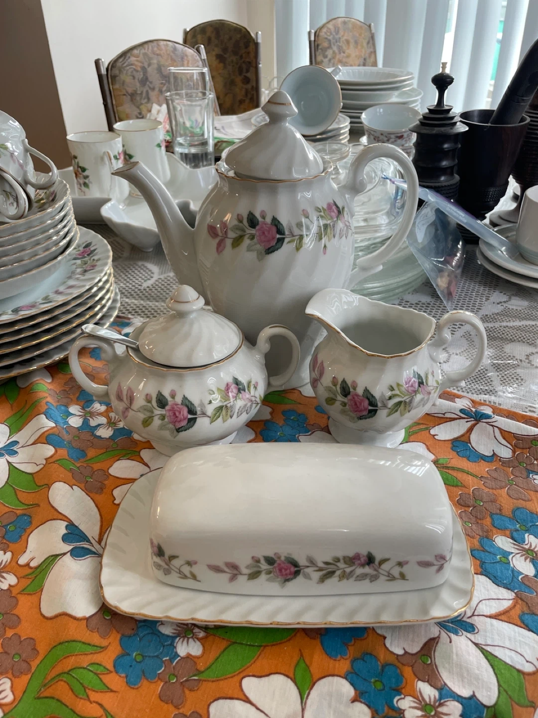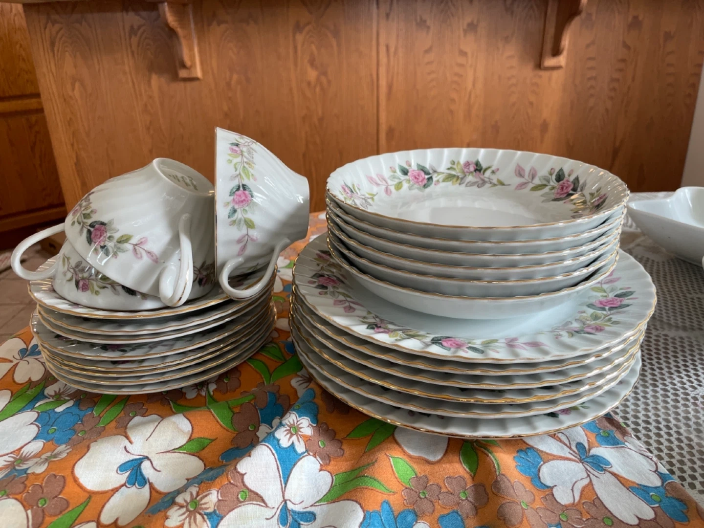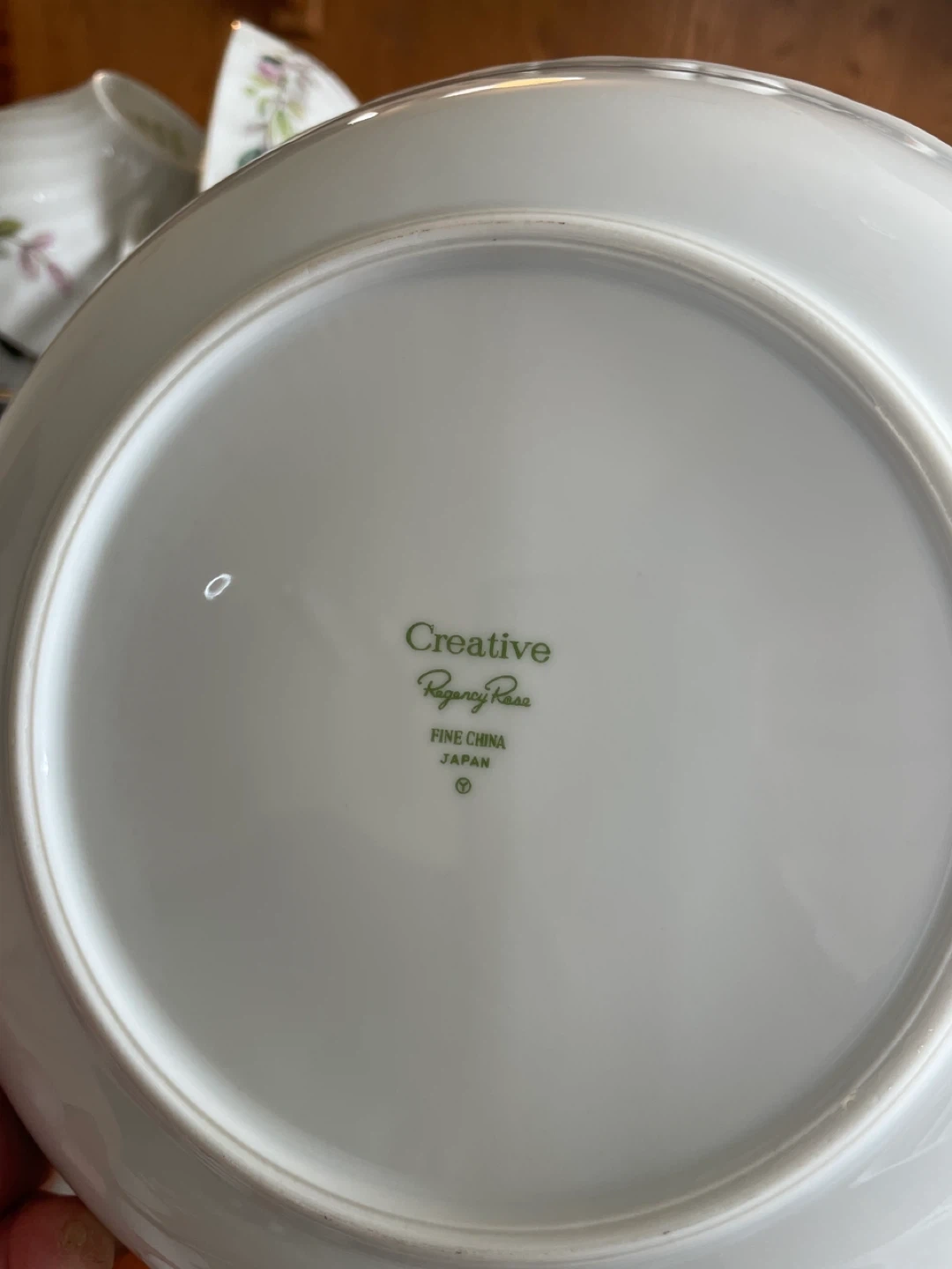 This is a partial set of Creative Regency Rose fine china, made in Japan. It features a delicate floral pattern with gold trim.