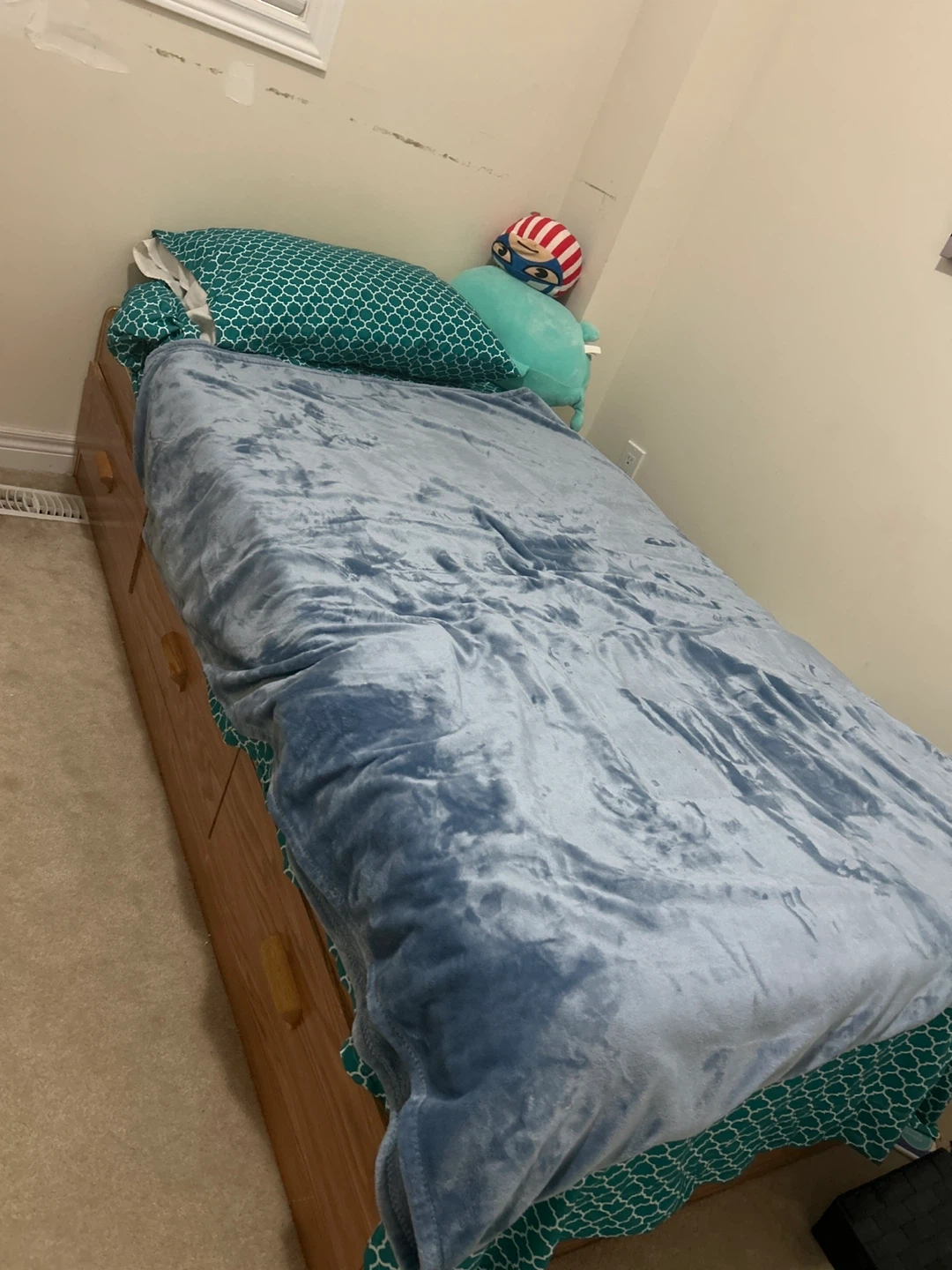 Single bed frame made of light-coloured wood. It features four built-in drawers for storage. Bedding and pillows shown are not included.