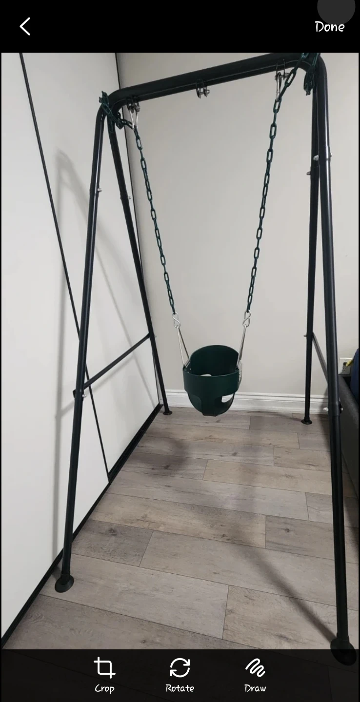 This is a KINSPORY toddler swing in green and stand set. The swing seat has a high back for support. It's designed for indoor or outdoor use. The stand is approximately 190cm tall and 113cm wide.
