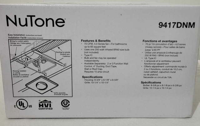 Brand new in box. Features: 70 CFM, 4.0 Audible Sones, for rooms up to 65 sq. ft.; robust steel housing and adjustable mounting brackets for easy install; Requires one 250-watt R40/BR40 infrared bulb for comfortable heat. Comparable to $90 plus tax from Home Depot.