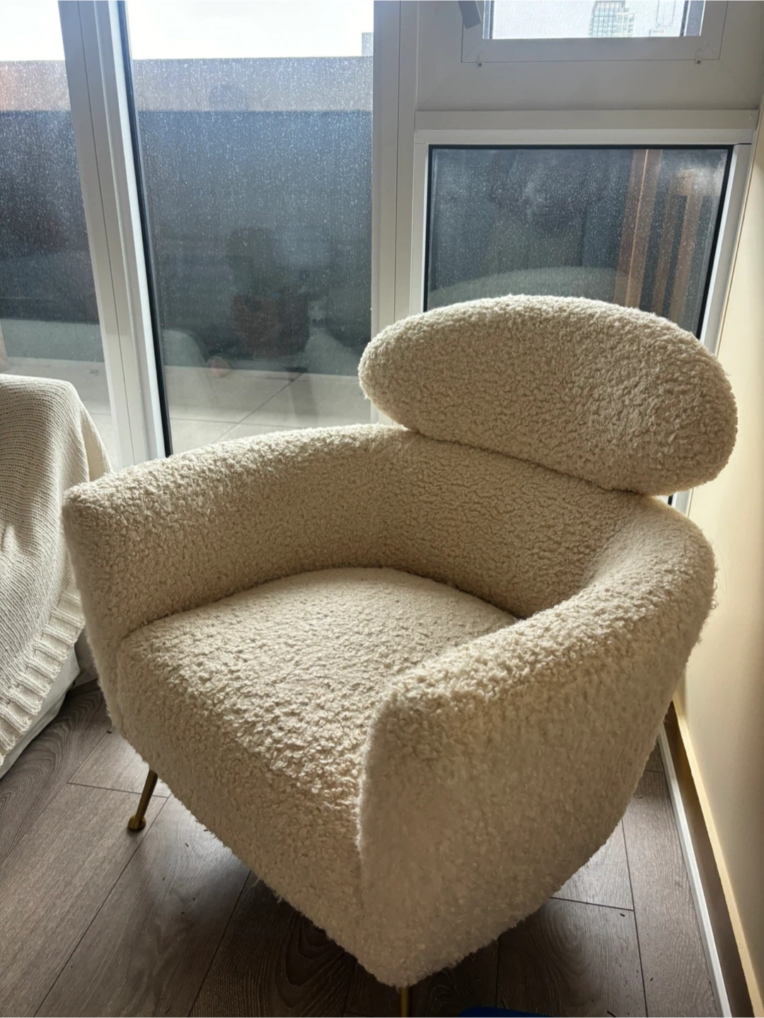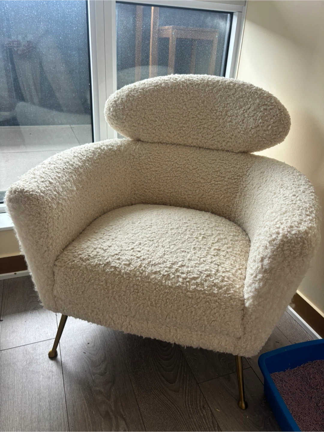 Selling a cozy cream boucle accent chair! It's in great condition and would look lovely in any living space. The chair features a soft, textured boucle fabric and a supportive back cushion. Perfect for adding a touch of warmth and style to your home